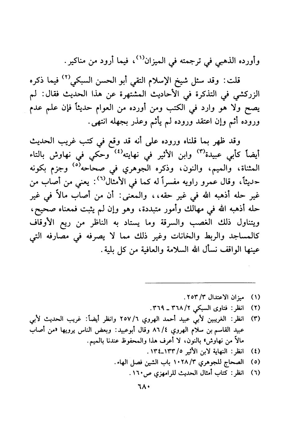 وقد ظهر بما قلناه وروده على أنه قد وقع في كتب غريب الحديث أيضًا كأبي عبيدة وابن الأثير في نهايته وحكي في نهاوش بالتاء المثناة، والميم، والنون، وذكره الجوهري في صحاحه وجزم بكونه حديثًا، وقال عمرو راويه مفسرًا له كما في الأمثال: يعني من أصاب من غير حله أذهبه الله في غير حقه، والمعنى: أن من أصاب مالاً في غير حله أذهبه الله في مهالك وأمور متبددة، وهو وإن لم يثبت فمعناه صحيح، ويتناول ذلك الغضب والسرقة وما يستاد به الناظر من ريع الأوقاف كالمساجد والربط والخانات وغير ذلك مما لا يصرفه في مصارفه التي عينها الواقف نسال الله السلامة والعافية من كل بلية.