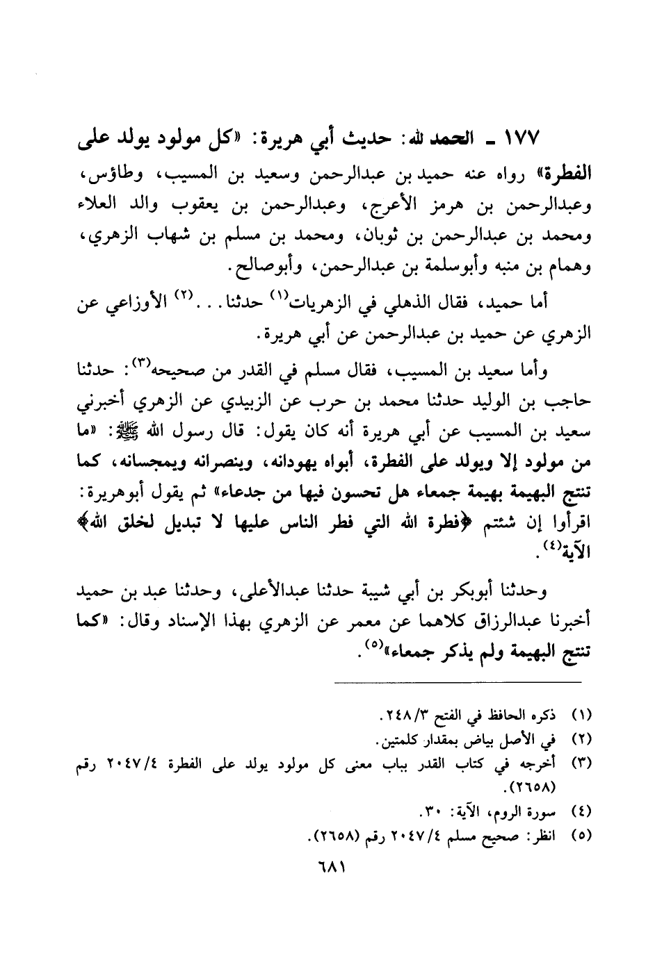 177 - الحمد لله: حديث أبي هريرة: "كل مولود يولد على الفطرة" رواه عند حميد بن عبد الرحمن وسعيد بن المسيب، وطاؤس، وعبد الرحمن بن هرمز الأعرج، وعبد الرحمن بن يعقوب والد العلاء ومحمد بن عبد الرحمن بن ثوبان، ومحمد بن مسلم بن شهاب الزهر، وهمام بن منبه وأبو سلمة بن عبد الرحمن، وأبو صالح.