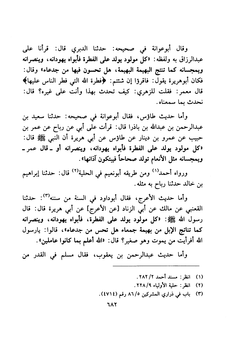 وقال أبو عوانة في صحيحه: حدثنا الدبري قال: قرأنا علي عبد الرازق به ولفظه: "كل مولود يولد على الفطرة فأبواه يهودانه، وينصرانه ويمجسانه كما تنتج البهيمة البهيمة، هل تحسون فيها من جدعاء" وقال: فكان أبو هريرة يقول: فاقرؤا إن شئتم: (فطرة الله التي فطر الناس عليها) قال معمر: فقلت للزهري: كيف تحدث بهذا وأنت على غيره؟ قال: نحدث بما سمعناه.