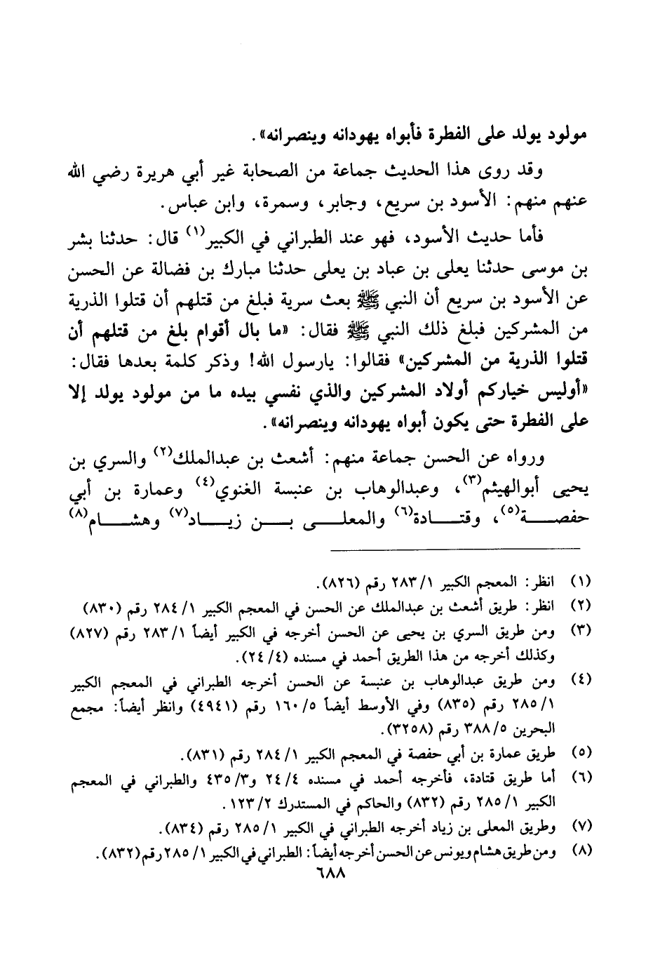 فأما حديث الأسود، فهو عند الطبراني في الكبير قال: حدثنا بشر بن موسى حدثنا يعلي بن عباد بن يعلي حدثنا مبارك بن فضالة عن الحسن عن الأسود بن سريع أن النبي صلى الله عليه وسلم بعث سرية فبلغ من قتلهم أن قتلوا الذرية من المشركين فبلغ ذلك النبي صلى الله عليه وسلم فقال: "ما بال أقوام بلغ من قتلهم أن قتلوا الذرية من المشركين" فقالوا: يا رسول الله! وذكر كلمة بعدها فقال: "أو ليس خياركم أولاد المشركين والذي نفسي بيده ما من مولود يولد إلا على الفطرة حتى يكون أبواه يهودانه وينصرانه".