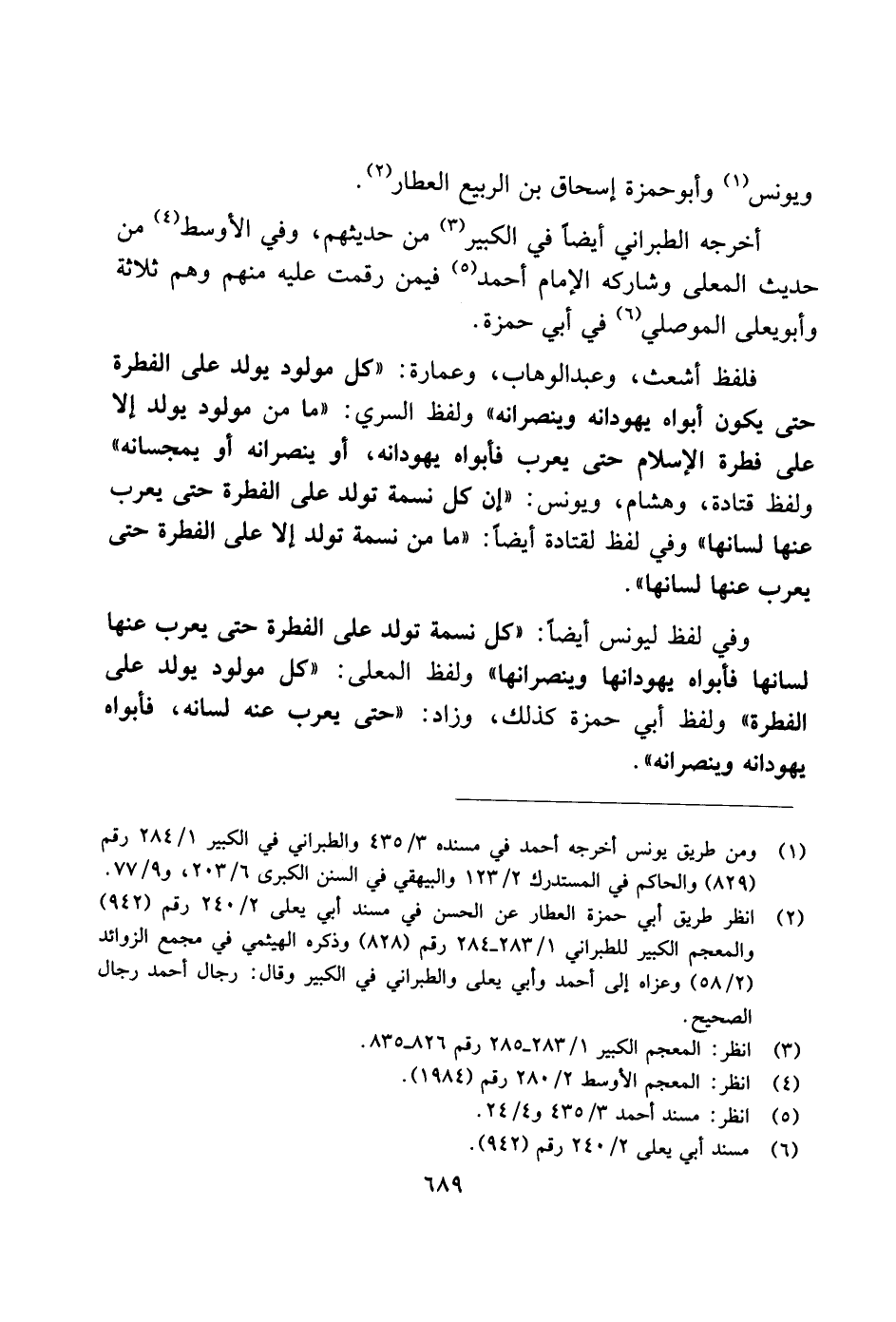 وفي لفظ ليونس أيضًا: "كل نسمة تولد على الفطرة حتى يعرب عنها لسانا فأبواه يهودانها وينصرانها" ولفظ المعلي: "كل مولود يولد على الفطرة" ولفظ أبي حمزة كذلك، وزاد: "حتى يعرب عنه لسانه، فأبواه يهودانه وينصرانه".