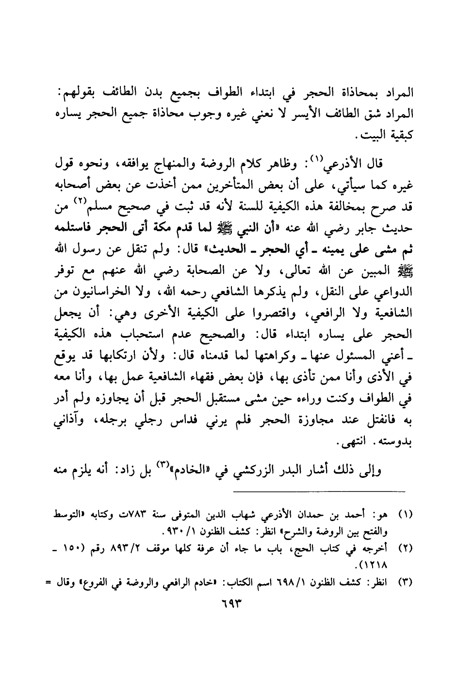 قال الأذرعي: وظاهر كلام الروضة والمنهاج يوافقه، ونحوه قول غيره كما سيأتي، على أن بعض المتأخرين ممن أخذت عن بعض أصحابه قد صرح بمخالفة هذه الكيفية للسنة لأنه قد ثبت في صحيح مسلم من حديث جابر رضي الله عنه "أن النبي صلى الله عليه وسلم لما قدم مكة أتى الحجر فاستلمه ثم مشى على يمينه ـ أي الحجر ـ الحديث" قال: ولم تنقل عنرسول الله صلى الله عليه وسلم المبين عن الله تعالى، ولا عن الصحابة رضي الله عنهم مع توفر الدواعي على النقل، ولم يذكرها الشافعي رحمه الله، ولا الخراسانيون من الشافعية ولا الرافعي، واقتصروا على الكيفية الأخرى وهي: أن يجعل الحجر على يساره ابتداء قال: والصحيح عدم استحباب هذه الكيفية ـ أعني المسئول عنها ـ وكراتهتها لما قدمناه قال: ولأن ارتكابها قد يوقع في الأذى وأنا ممن تأذى بها، فإن بعض فقهاء الشافعية عمل بها، وأنا معه ف الطواف وكنت وراءه حين مشى مستقبل الحجر قبل أن يجاوزه ولم أدر به فانفتل عند مجاوزة الحجر فلم يرني فداس رجلي برجله، وآذاني بدوسته. انتهى.
