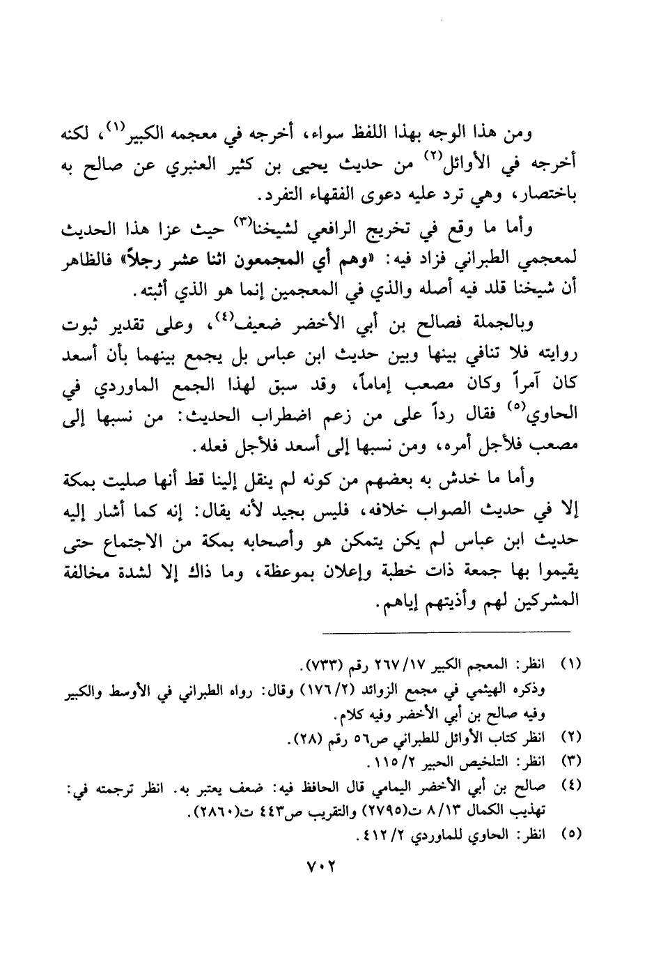 وأما ما وقع في تخريج الرافعي لشيخنا حيث عزا هذا الحديث لمعجمي الطبراني فزاد فيه: "وهم أي المعجمون اثنا عشر رجلاً" فالظاهر أن شيخنا قلد فيه أصله والذي في المعجمين إنما هو الذي أثته.