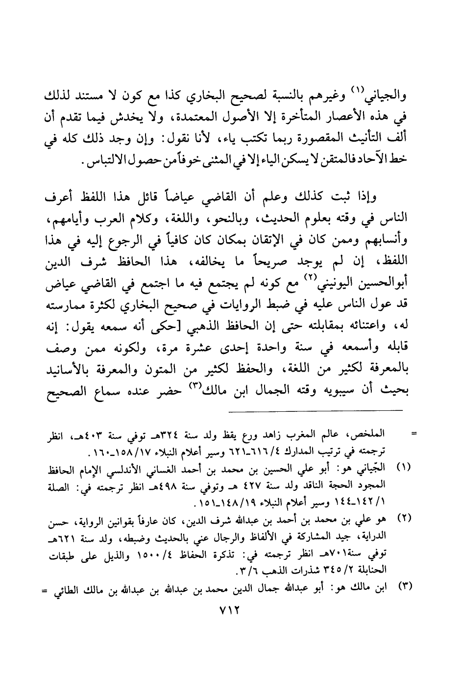 وإذا ثبت كذلك وعلم أن القاضي عياض قائل هذا اللفظ أعرف الناس في وقته بعلوم الحديث، وبالنحو، واللغة، وكلام العرب وأيامهم، وأنسابهم وممن كان في الإتقان بمكان كان كافيًا في الرجوع إليه في هذا اللفظ، إن لم يوجد صريحًا ما يخالفه، هذا الحافظ شرف الدين أبو الحسين اليونيني مع كونه لم يجتمع فيه ما اجتمع في القاضي عياض قد عول الناس عليه في ضبط الروايات في صحيح البخاري لكثرة ممارسته له، واعتنائه بمقابلته حتى إن الحافظ الذهبي [حكى أنه سمعه يقول: إنه قابله وأسمعه في سنة واحدة إحدى عشرة مرة، ولكنه ممن وصف بالمعرفة لكثير من اللغة، والحفظ لكثير من المتون والمعرفة بالأسانيد بحيث أن سيبويه وقته الجمال ابن مالك حضر عنده سماع الصحيح