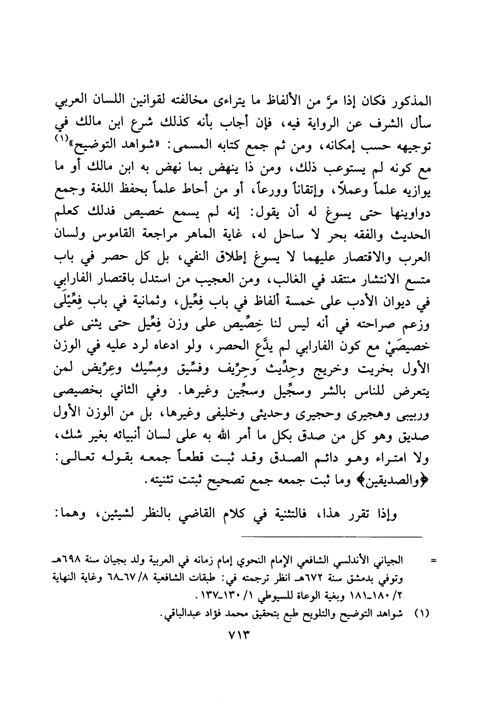 المذكور فكان إذا مرَّ من الألفاظ ما يتراءى مخالفته لقوانين اللسان العربي سأل الشرف عن الرواية فيه، فإن أجاب بأنه كذلك شرع ابن مالك في توجيهه حسب إمكانه، ومن ثم جمع كتابه المسمى: "شواهد التوضيح" مع كونه لم يستوعب ذلك، ومن ذا ينهض بما نهض به ابن مالك أو ما يوازيه علمًا وعملاً، وإتقانًا وورعًا، أو من أحاط علمًا بحفظ اللغة وجمع دواوينها حتى يسوغ له أن يقول: إنه لم يسمع خصيص فدلك كعلم الحديث والفقه بحر لا ساحل له، غاية الماهر مراجعة القاموس ولسان العرب والاقتصار عليهما لا يسوغ إطلاق النفي، بل كل حصر في باب متسع الانتشار منتقد في الغالب، ومن العجيب من استدل باقتصار الفارابي في ديوان الأدب على خمسة ألفاف في باب فعيل، وثمانية في باب فعيلي وزعم صراحته في أنه ليس لنا خصيص على وزن فعيل حتى يثنى على خصيصي مع كون الفارابي لم يدع الحصر، ولو ادعاه لرد عليه في الوزن الأول بخريت وخريج وحديث وحريف وفسيق ومسيك وعريض لمن يتعرض للناس بالشر وسجيل وسجين وغيرها. وفي الثاني بخصيصي وربيبي وهجيري وحجيري وحديثي وخليفي وغيرها، بل من الوزن الأول صديق وهو كل من صدق بكل ما أمر الله به على لسان أنبيائه بغير شك، ولا امتراء وهو دائم الصدق وقد ثبت قطعًا جمعه بقوله تعالى: (والصديقين) وما ثبت جمعه جمع تصحيح ثبتت تثنيته.