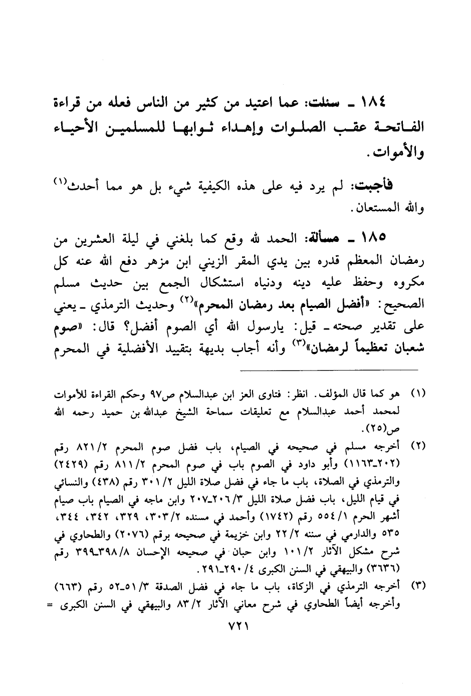 185 - مسألة: الحمد لله وقع كما بلغني في ليلة العشرين من رمضان المعظم قدره بين يدي المقر الزيني ابن مزهر دفع الله عنه كل مكروه وحفظ عليه دينه ودنياه استشكال الجمع بين حديث مسلم الصحيح: "أفضل الصيام بعد رمضان المحرم" وحديث الترمذي ـ يعني على تقدير صحته ـ قيل: يا رسول الله أي الصوم أفضل؟ قال: "صوم شعبان تعظيمًا لرمضان" وأنه أجاب بديهة بتقييد الأفضلية في المحرم