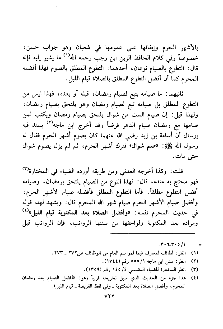 ثانيهما: ما صيامه يتبع لصيام رمضان، قبله أو بعده، فهذا ليس من التطوع المطلق بل صيامه تبع لصيام رمضان وهو يلتحق بصيام رمضان، ولهذا قيل: إن صيام الست من شوال يلتحق بصيام رمضان ويكتب لمن صامها مع رمضان صيام الدهر فرضًا وقد أخرج ابن ماجه بسند فيه إرسال أن أسامة بن زيد رضي الله عنهما كان يصوم أشهر الحرم فقال له رسول الله صلى الله عليه وسلم: "صم شوال" فترك أشهر الحرم، ثم لم يزل يصوم شوال حتى مات.