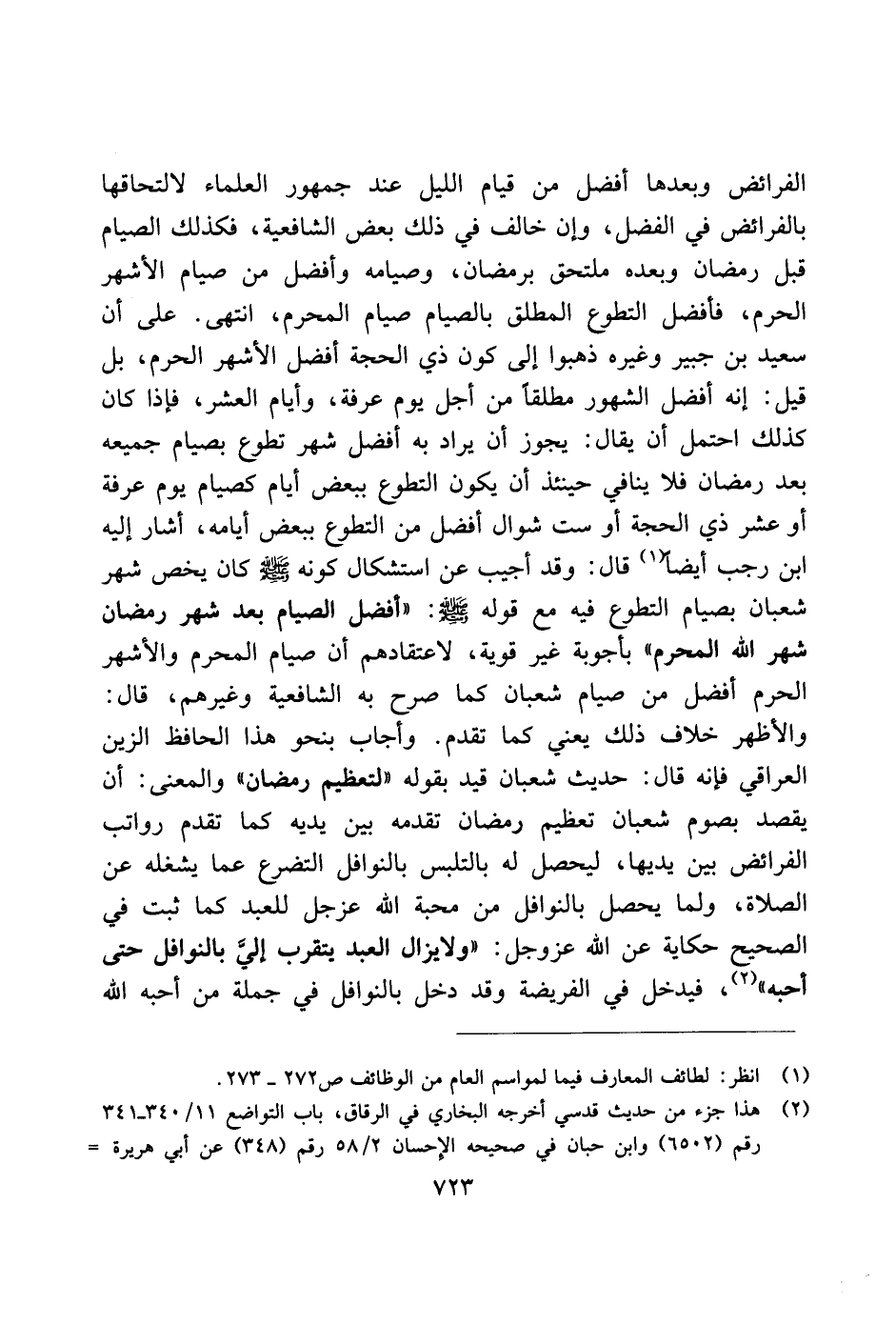 الفرائض وبعدها أفضل من قيام الليل عند جمهور العلماء لالتحاقها بالفرائض في الفصل، وإن خالف في ذلك بعض الشافعية، فكذلك الصيام قبل رمضان وبعده ملتحق برمضان، وصيامه وأفضل من صيام الأشهر الحرم، فأفضل التطوع المطلق بالصيام صيام المحرم، انتهى. على أن سعيد بن جبير وغيره ذهبوا إلى كون ذي الحجة أفضل الاشهر الحرم، بل قيل: إنه أضل الشهور مطلقًا منأجل يوم عرفة، وأيام العشر، فإذا كان كذلك احتمل أن يقال: يجوز أن يراد به أفضل شهر تطوع بصيام جميعه بعد رمضان فلا ينافي حينئذ أن يكون التطوع ببعض أيام كصيام يوم عرفة أو عشر ذي الحجة أو ست شوال أفضل من التطوع ببعض أيامه، اشار إليه ابن رجب أيضًا قال: وقد أجيب عن استشكال كونه صلى الله عليه وسلم كان يخص شهر شعبان بصيام التطوع فيه مع قوله صلى الله عليه وسلم: "أفضل الصيام بعد شهر رمضان شهر الله المحرم" بأجوبة غير قوية، لاعتقادهم أن صيام المحرم والأشهر الحرم أفضل من صيام شعبان كما صرح به الشافعية وغيرهم، قال: والأظهر خلاف ذلك يعني كا تقدم. وأجاب بنحو هذا الحافظ الزين العراقي فإنه قال: حديث شعبان قيد بقوله "لتعظيم رمضان" والمعنى: أن يقصد بصوم شعبان تعظيم رمضان تقدمه بين يديه كما تقدم رواتب الفرائض بين يديها، ليحصل له بالتلبس بالنوافل التضرفع عما يشغله عن الصلاة، ولما يحصل بالنوافل من محبة الله عز وجل للعبد كما ثبت في الصحيح حكاية عن الله عز وجل: "ولا يزال العبد يتقرب إليّ بالنوافل حتى أحبه"، فيدخل في الفريضة وقد دخل بالنوافل في جملة من أحبه الله
