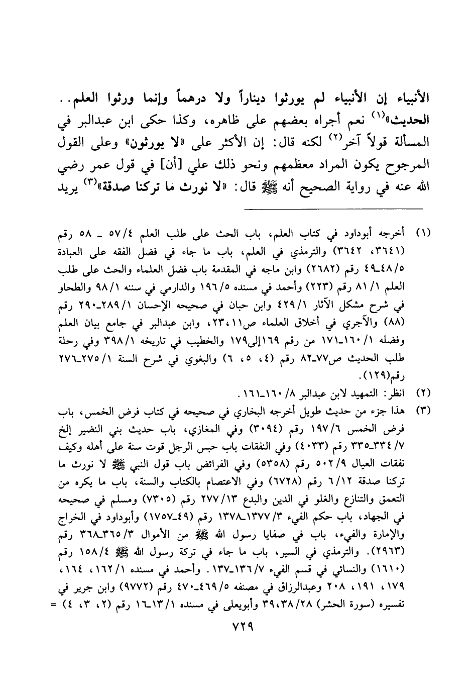الأنبياء إن الأنبياء لم يورثوا دينارًا ولا درهمًا وإنما ورثوا العلم .. الحديث" نعم أجراه بعضهم على ظاهره، وكذا حكى ابن عبد البر في المسألة قولاً آخر لكنه قال: إن الأكثر على "لا يورثون" وعلى القول المرجوح يكون المراد معظمهم ونحو ذلك على [أن] في قول عمر رضي الله عنه في رواية الصحيح أنه صلى الله عليه وسلم قال: "لا نورث ما تركنا صدقة" يريد
