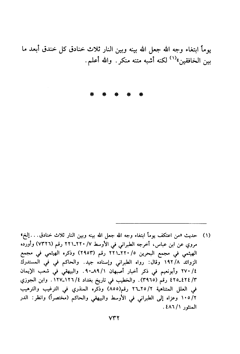 يومًا ابتغاء وجه الله جعل الله بينه وبين النار ثلاث خنادق كل خندق أبعد ما بني الخافقين" لكنه متنه منكر. والله أعلم.