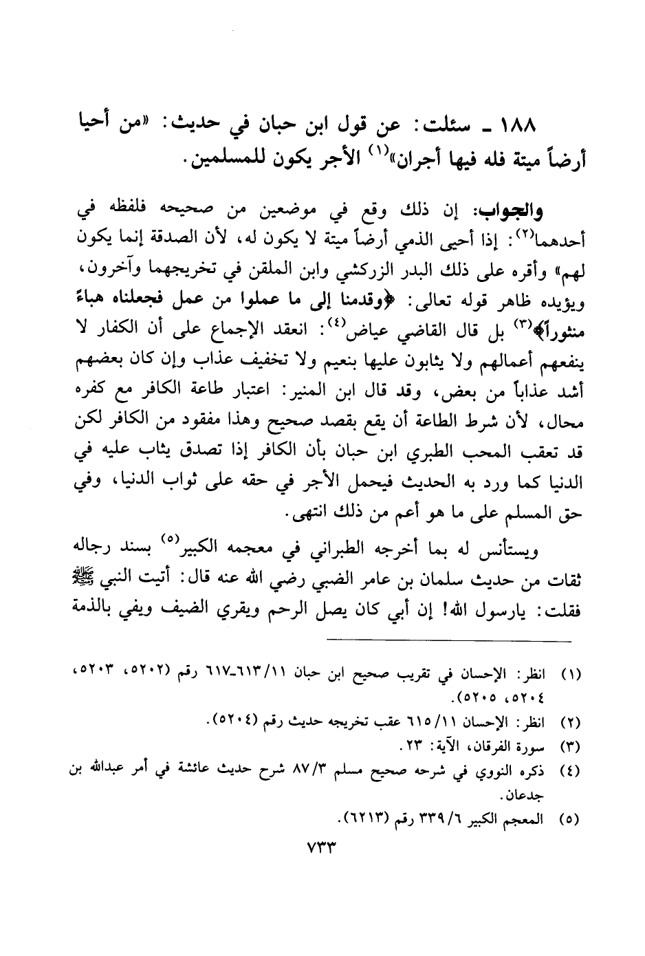 والجواب: إن ذلك وقع في موضعين من صحيحه فلفظه في أحدهما: إذا أحيى الذمي أرضًا ميتة لا يكون له، لأن الصدقة إنما يكون لهم" وأقره على ذلك البدر الزركشي وابن الملقن في تخريجهما وأخرون، ويؤيده ظاهر قوله تعالى: (وقدمنا إلى ما عملوا من عمل فجعلناه هباءً منثورًا) بل قال القاضي عياض: انعقد الإجماع على أن الكفار لا ينفعهم أعمالهم ولا يثابون عليها بنعيم ولا تخفيف عذاب وإن كان بعضهم أشد عذابًا من بعض، وقد قال ابن المنير: اعتبار طاعة الكافر مع كفره محال، لأن شرط الطاعة أن يقع بقصد صحيح وهذا مفقود من الكافر لكن قد تعقب المحب الطبري ابن حبان بأن الكافر إذا تصدق يثاب عليه في الدنيا كما ورد به الحديث فيحمل الأجر في حقه على ثواب الدنيا، وفي حق المسلم على ما هو أعم من ذلك انتهى.