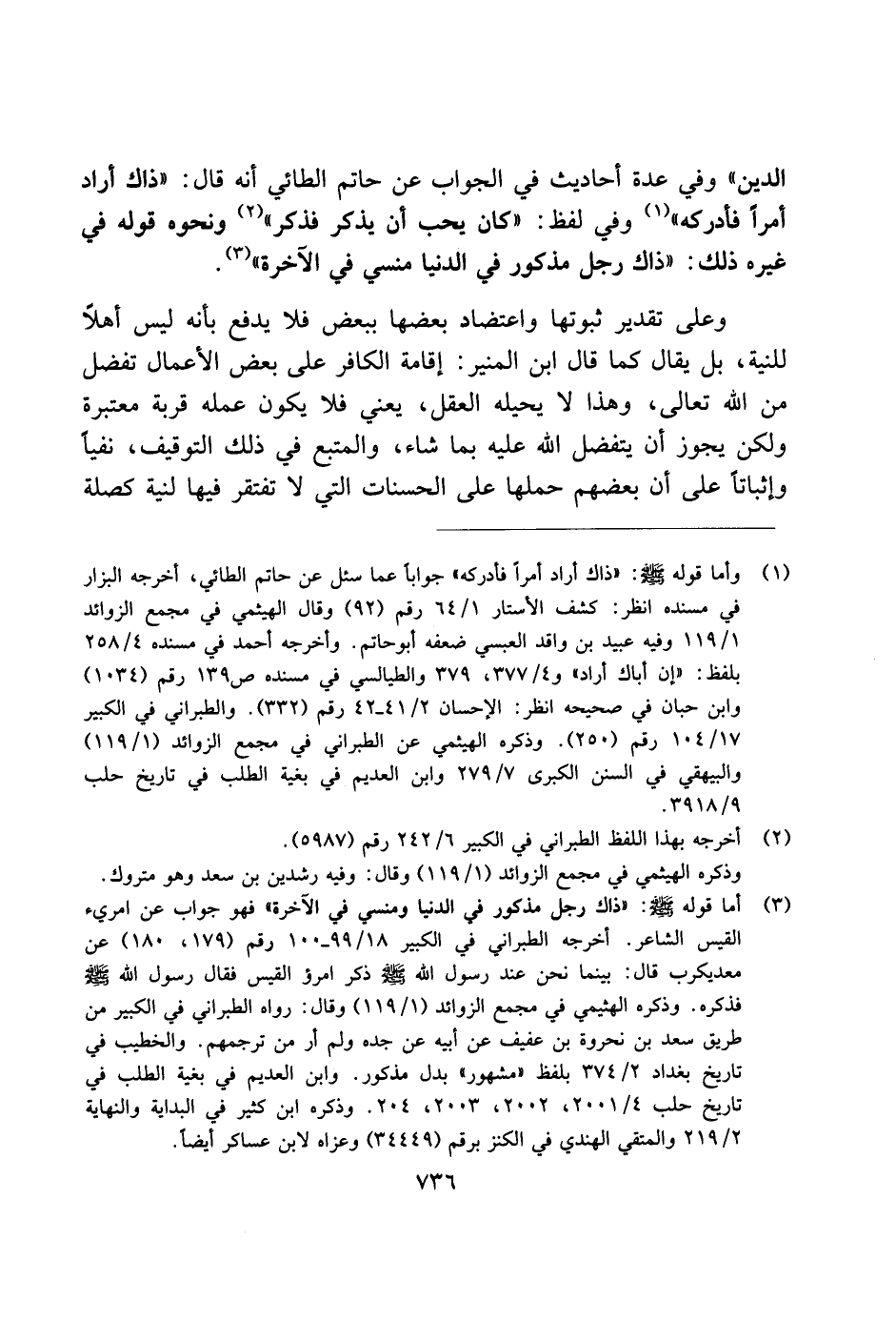 الدين" وفي عدة أحاديث في الجواب عن حاتم الطائي أنه قال: "ذاك أراد أمرًا فأدركه" وفي لفظ: "كان يحب أن يذكر فذكر" ونحوه قوله في غيره ذلك: "ذاك رجل مذكور في الدنيا منسي في الآخرة".
