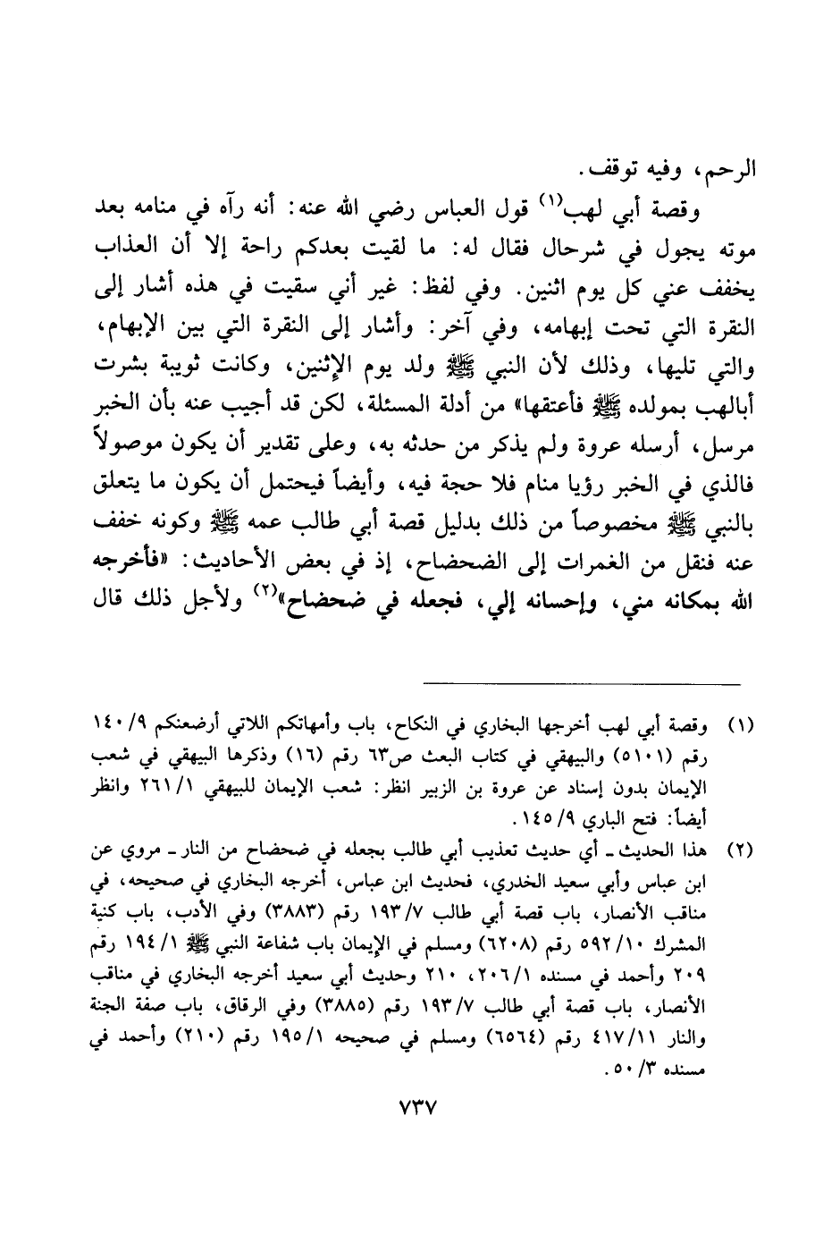 وقصة أبي لهب قول العباس رضي الله عنه: أنه رآه في منامه بعد موته يجول في شرحال فقال له: ما لقيت بعدكم راحة إلا أن العذاب يخفف عني كل يوم اثنين. وفي لفظ: غير أني سقيت في هذه أشار إلى النقرة التي تحت إبهامه، وفي آخر: وأشار إلى النرة التي بين الإبهام، والتي تليها، وذلك لأن النبي صلى الله عليه وسلم ولد يوم الأثنين، وكانت ثويبة بشرت ابا لهب بمولده صلى الله عليه وسلم فأعتقها" من أدلة المسئلة، لكن قد أجيب عنه بأن الخبر مرسل، أرسله عروة ولم يذكر من حدثه به، وعلى تقدير أن يكون موصولاً فالذي في الخبر رؤيا منام فلا حجة فيه، وأيضًا فيحتمل أن يكون ما يتعلق بالنبي صلى الله عليه وسلم مخصوصًا من ذلك بدليل قصة أبي طالب عمه صلى الله عليه وسلم وكونه خفف عنه فنقل من الغمرات إلى الضحضاح، إذ في بعض الأحاديث: "فأخرجه الله بمكانه مني، وإحسانه إلي، فجعله في ضحضاح" ولأجل ذلك قال