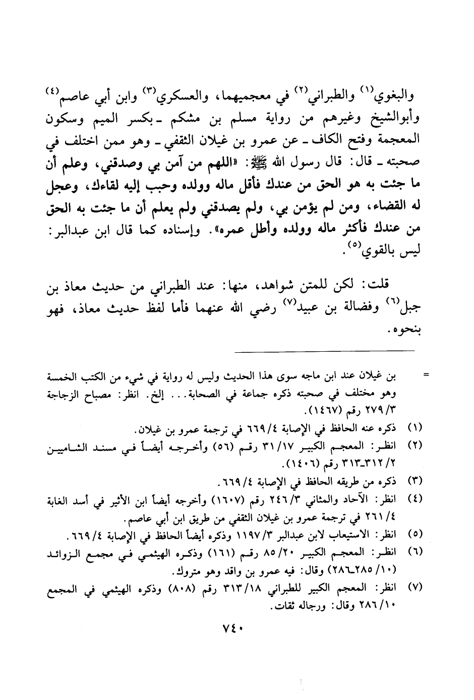 والبغوي والطبراني في معجميهما، والعسكري وابن أبي عاصم وأبو الشيخ وغيرهم من رواية مسلم بن مشكم ـ بكسر الميم وسكون المعجمة وفتح الكاف ـ عن عمر بن غيلان الثقفي ـ هو ممن اختلف في صحبته ـ قال: قال رسول الله صلى الله عليه وسلم: "اللهم من آمن بي وصدقني، وعلم أن ما جئت به هو الحق من عندك فأقل ماله وولده وحبب إليه لقاءك، وعجل له القضاء، ومن لم يؤمن بي، ولم يصدقني ولم يعلم أن ما جئت به الحق من عندك أكثر ماله وولده وأطل عمره". وإسناده كما قال ابن عبد البر: ليس بالقوي.