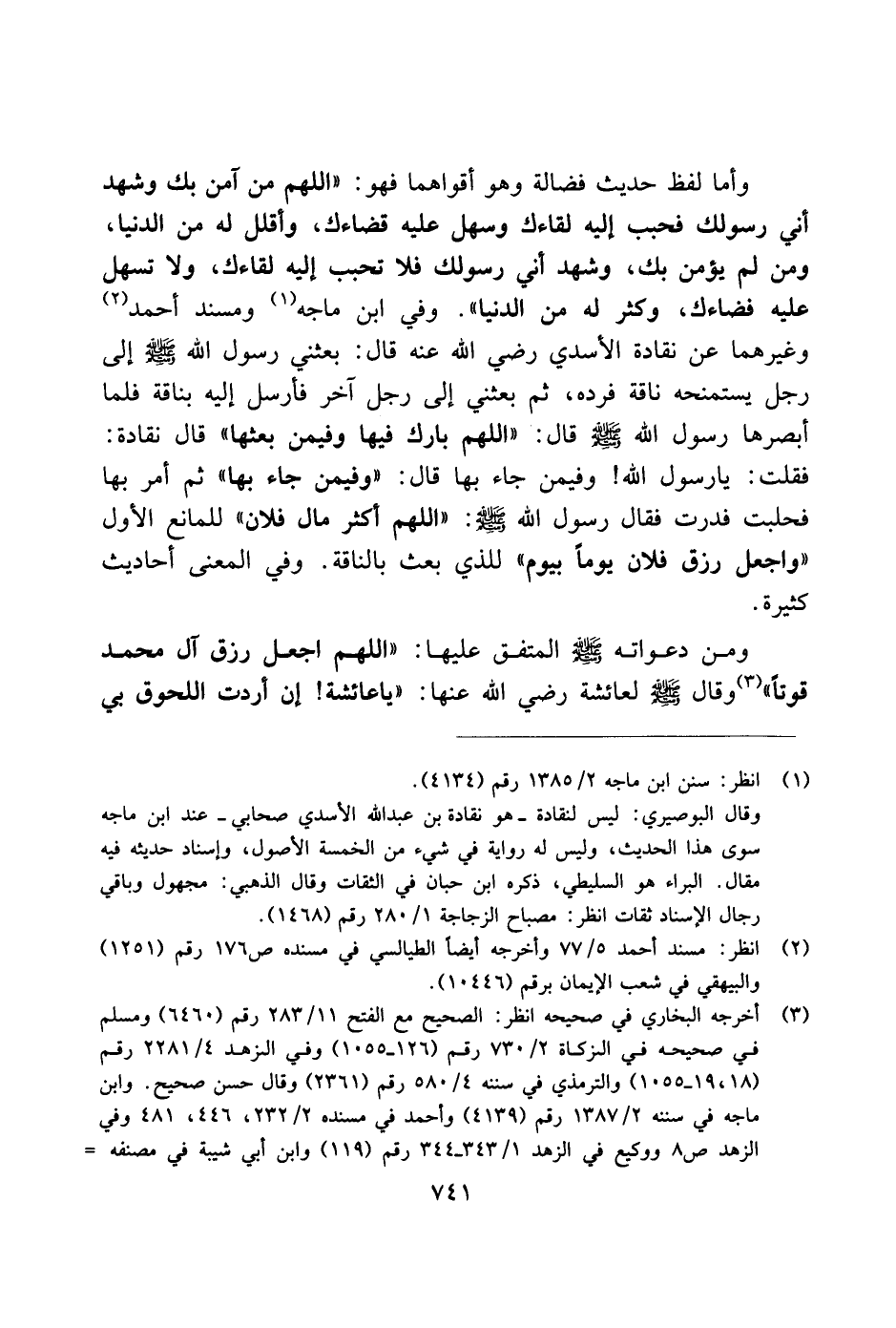 وأما لفظ حديث فضالة وهو أقواهما فهو: "اللهم من آمن بك وشهد أني رسولك فحب إليك لقاءك وسهل عليه قضاءك، وأقلل له من الدنيا، ومن لم يؤمن بك، وشهد أني رسولك فلا تحب إليه لقاءك، ولاتسهل عليه فضاءك، وكثر له من الدنيا". وي ابن ماجه ومسند أحمد وغيرهما عن نقادة الأسدي رضي الله عنه قال: بعثني رسول الله صلى الله عليه وسلم إلى رجل يستمنحه ناقة فرده، ثم بعثني إلى رجل آخر فارسل إليه بناقة فلما أبصرها رسول الله صلى الله عليه وسلم قال: "اللهم بارك فيها ويمن بعثها" قال نقادة: فقلت: يا رسول الله! وفيمن جاء بها قال: "وفيمن جاء بها" ثم أمر بها فحلبت فدرت فقال رسول الله صلى الله عليه وسلم: "اللهم أكثر مال فلان" للمانع الأول "واجعل رزق لان يومًا بيوم" للذي بعث بالناقة. وفي المعنى أحاديث كثيرة.