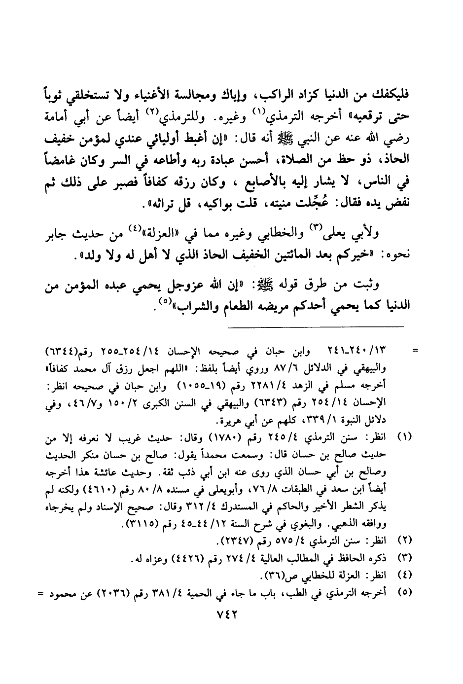 فليكفك من الدنيا كزاد الراك، وإياك ومجالسة الأغنياء ولا تستخلفي ثوبًا حتى ترقعيه" أخرجه الترمذي وغيره. وللترمذي أيضًا عن أبي أمامة رضي الله عنه عن النبي صلى الله عليه وسلم أنه قال: "إن أغبط أوليائي عندي لمؤمن خفيف الحاذ، ذو حظ من الصلاة، أحسن عبادة ربه وأطاعه في السر وكان غامضًا في الناس، لا يشارإليه بالأصابع، وكان رزقه كفافًا فصبر على ذلك ثم نفض يده فقال: عُجلت منيته، قلت بواكيه، قل تراثه".