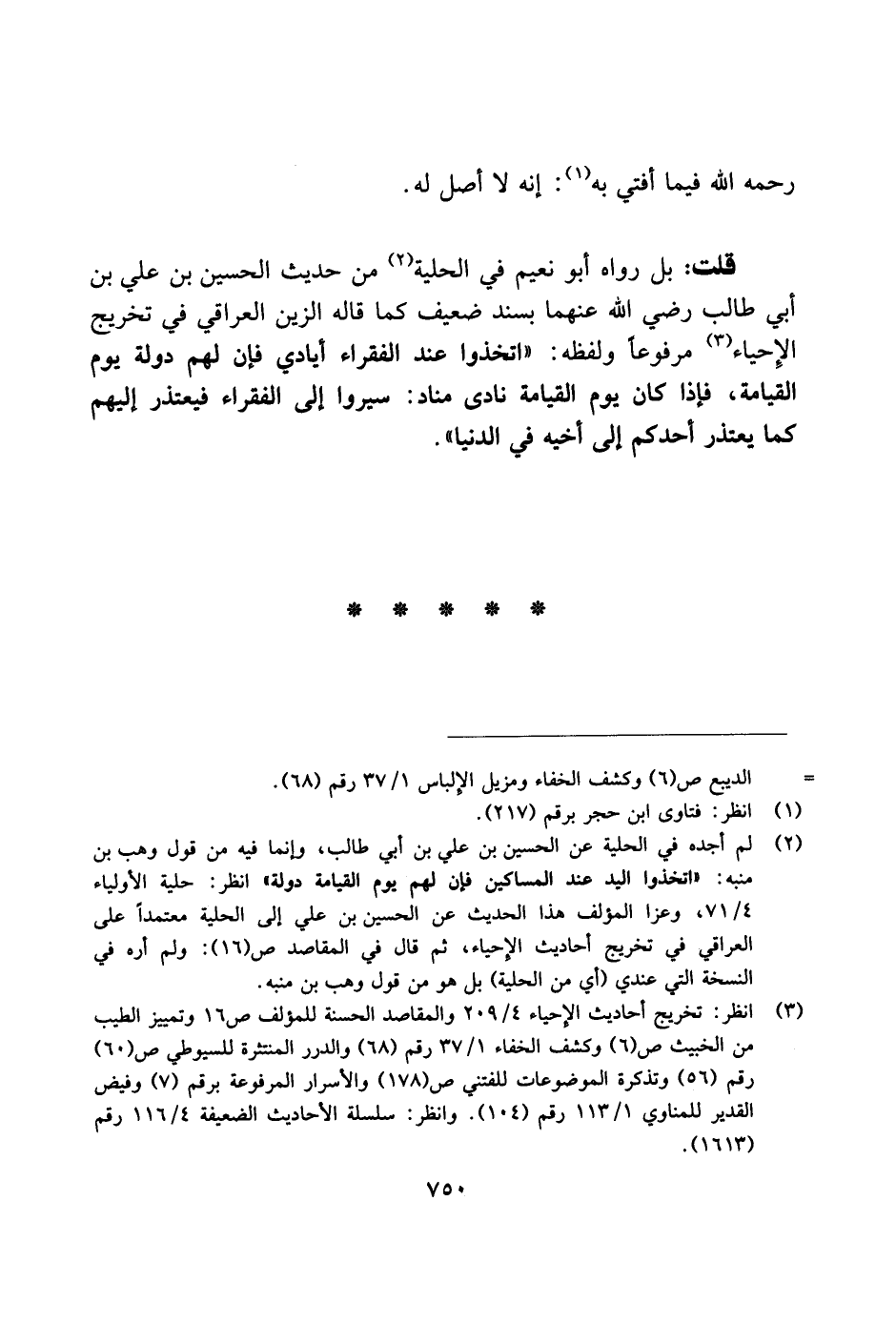 قلت: بل رواه أبو نعيم في الحلية من حديث الحسين بن علي بن ابي طالب رضي الله عنهما بسند ضعيف كما قاله الزين العراقي في تخريج الإحياء مرفوعًا ولفظه: "اتخذوا عند الفقراء أيادي فإن لهم دولة يوم القيامة، فإذا كان يوم القيامة نادى مناد: سيروا إلى الفقراء فيعتذر إليهم كما يعتذر أحكم إلى أخيه في الدنيا".