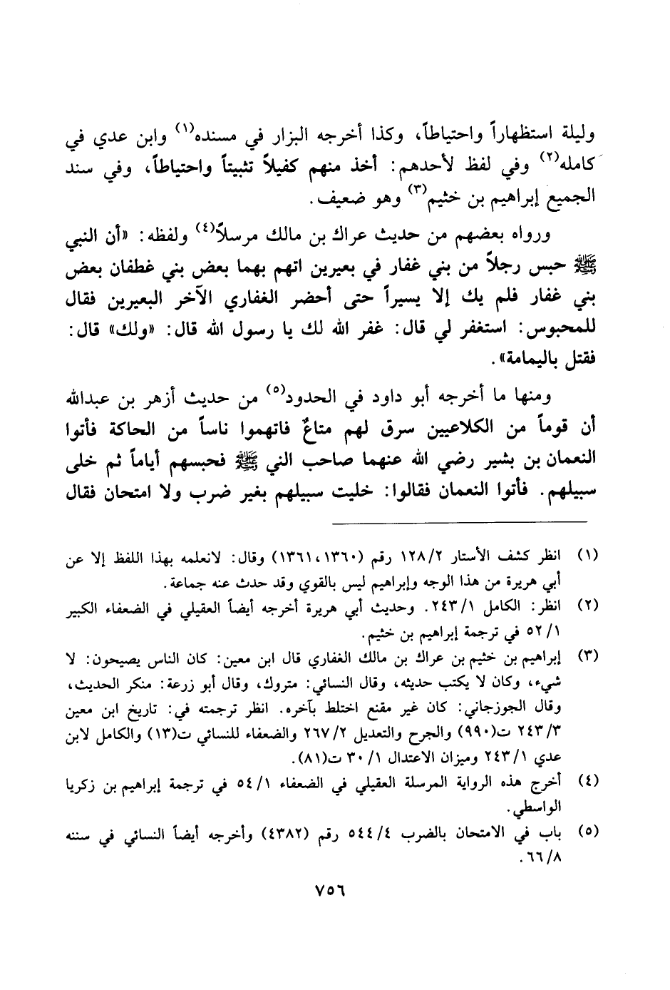 ومنها ما أخرجه أبو داود في الحدود من حديث أزهر بن عبد الله أن قومًأ من الكلاعيين سرق لهم متاع فاتهما ناسًا من الحاكة فأتوا النعمان بن بشير رضي الله عنهما صاحب النبي صلى الله عليه وسلم فحبسهم أيامًا ثم خلى سبيلهم. فأتوا النعمان فقالوا: خليت سبيلهم بغير ضرب ولا امتحان فقال