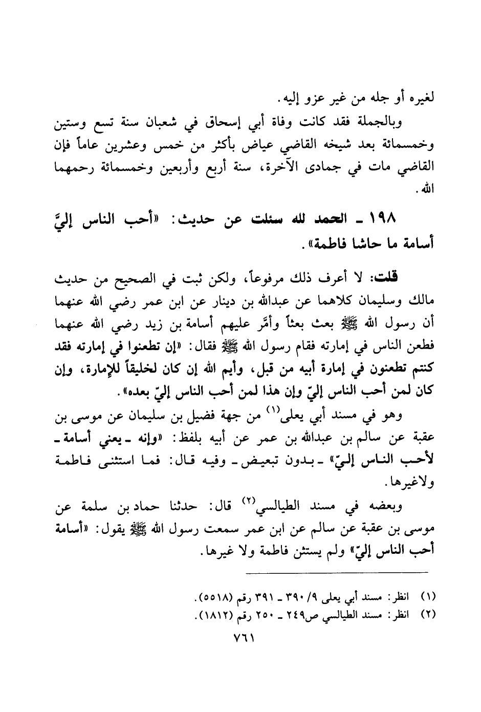 وبعضه في مسند الطيالسي قال: حدثنا حماد بن سلمة عن موسى بن عقبة عن سالم عن ابن عمر سمعت رسول الله صلى الله عليه وسلم يقول: "أسامة أحب الناس إليّ" ولم يستثن فاطمة ولا غيرها.