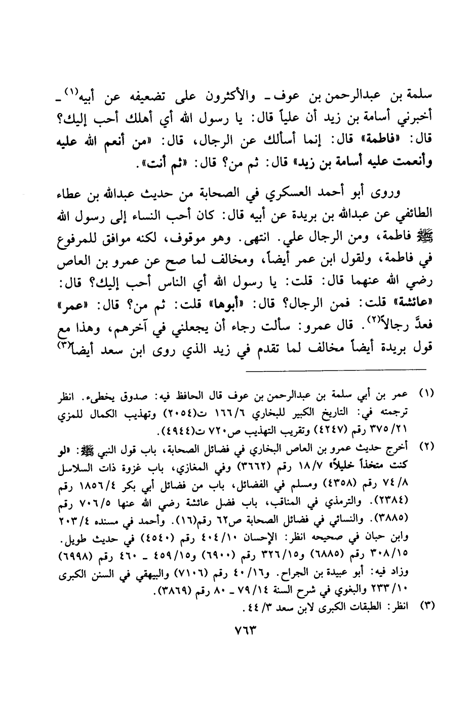 سلمة بن عبد الرحمن بن عوف ـ والأكثرون على تضعيفه عن أبيه ـ أخبرني أسامة بن زيد أن عليًا قال: يا رسول الله أي أهلك أحب إليك؟ قال: "فاطمة" قال: إنما أسألك عن الرال: قال: "من أنعم الله عليه وأنعمت عليه أسامة بن زيد" قال: ثم من؟ قال: "ثم أنت".