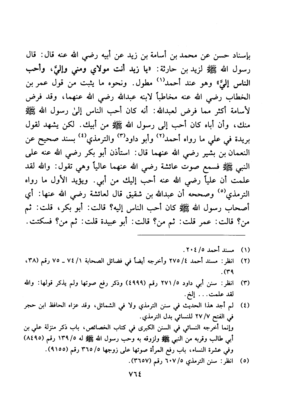 بإسناد حسن عن محمد بن أسامة بن زيد عن أبيه رضي الله عنه قال: قال رسول الله صلى الله عليه وسلم لزيد بن حارثة: "يا زيد أنت مولاي ومني وإلي، وأحب الناس إلي" وهو عند أحمد مطول. ونحوه ما يثبت من قول عمر بن الخطاب رضي الله عنه مخاطبًا لابنه عبد الله رضي الله عنهما، وقد فرض منك، وأن أباه كان أحب إلى رسول الله صلى الله عليه وسلم من أبيك. لكن يشهد لقول النعمان بن بشير رضي الله عنهما قال: استأذن أبو بكر رضي الله عنه على النبي صلى الله عليه وسلم فسمع صوت عائشة رضي الله عنهما عاليًا وهي تقول: والله لقد علمت أن عليًا رضي الله عنه أحب إليك من أبي. ويؤيد الأول ما رواه الترمذي وصححه أن عبد الله بن شقيق قال لعائشة رضي الله عنها: أي اصحاب رسول الله صلى الله عليه وسلم كان أحب الناس إليه؟ قالت: أبو بكر، قلت: ثم من؟ قالت: عمر قلت: ثم من؟ قالت: أبو عبيدة قلت: ثم من؟ فسكتت.