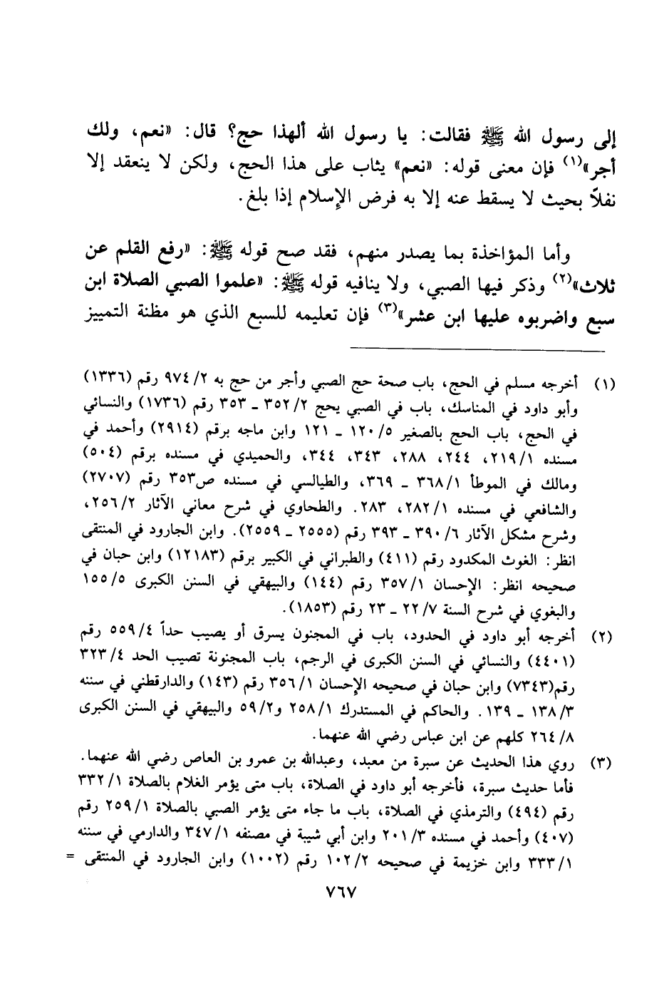 وأما المؤاخذة بما يصدر منهم، فقد صح قوله صلى الله عليه وسلم: "رفع القلم عن ثلاث" وذكر فيها الصبي، ولا ينافيه قوله صلى الله عليه وسلم: "علموا الصبي الصلاة ابن سبع واضربوه عليها ابن عشر" فإن تعليمه للسبع الذي هو مظنة التمييز