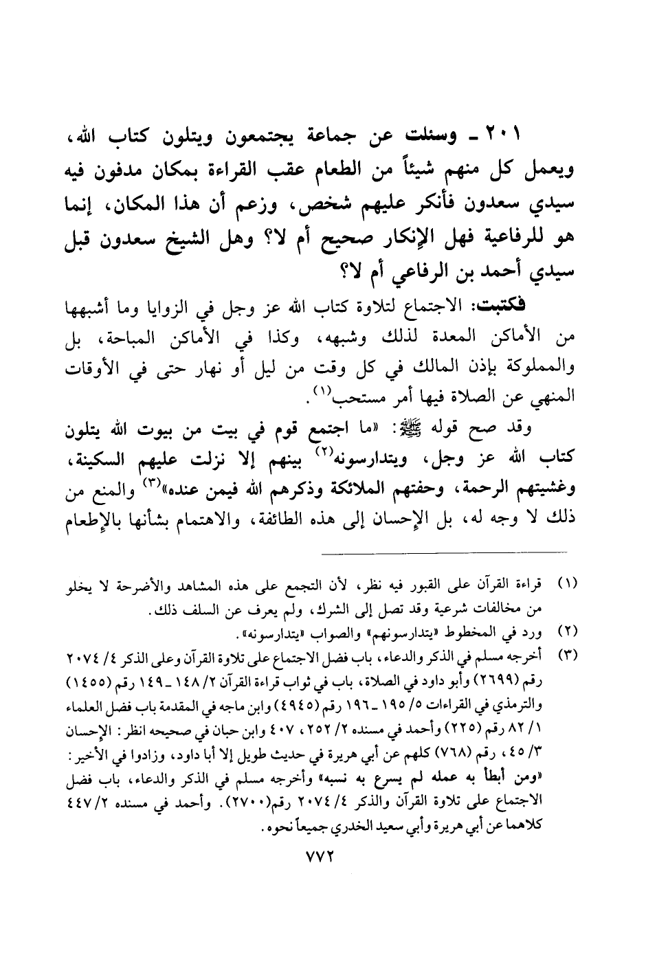 201 - وسئلت عن جماعة يجتمعون ويتلون كتاب الله، ويعمل كل منهم شيئًا من الطعام عقب القراءة بمكان مدفون فيه سيدي سعدون فأنكر عليهم شخص، وزعم أن هذا المكان، إنما هو للرفاعية فهل الإنكار صحيح أم لا؟ وهل الشيخ سعدون قبل سيدي أحمد بن الرفاعي أم لا؟