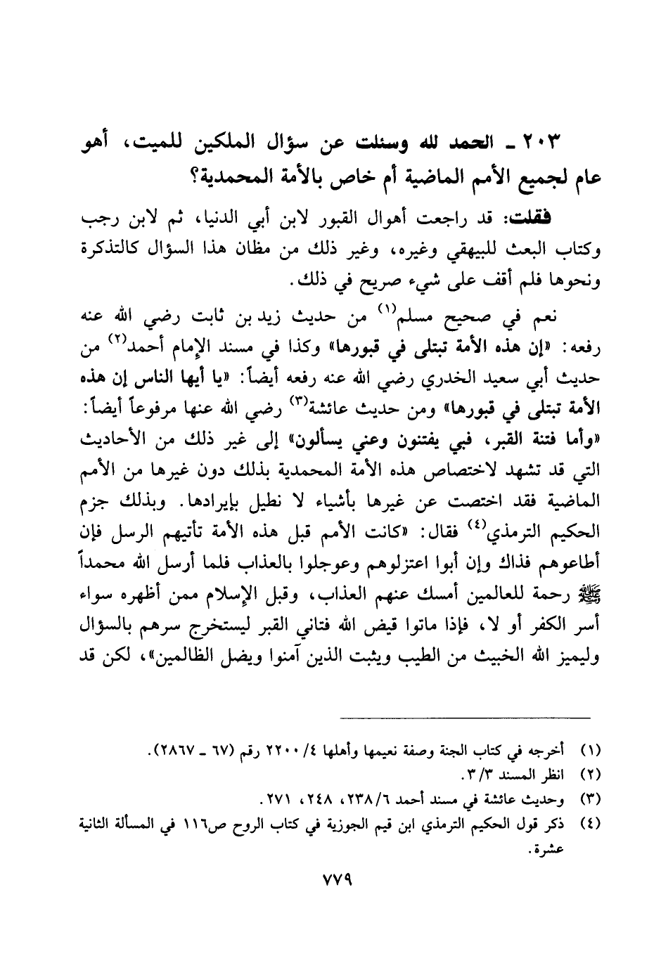 203 - الحمد لله وسئلت عن سؤال الملكين للميت، أهو عام لجميع الأمم الماضية أم خاص بالأمة المحمدية؟