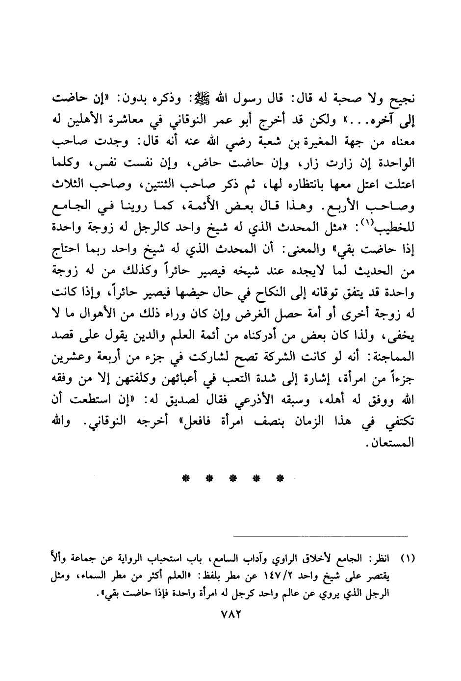 نجيح ولا صحبة له قال: قال رسول الله صلى الله عليه وسلم: وذكره بدون: "إن حاضت إلى آخره ... "ولكن قد أخرج أبو عمر النوقاني في معاشرة الأهلين له معناه من جهة المغيرة بن شعبة رضي الله عنه أنه قال: وجدت صاحب الواحدة إن زارت زار، وإن حاضت حاض، وإن نفست نفس، وكلما اعتلت اعتل معها بانتظاره لها، ثم ذكر صاحب الثنتين، وصاحب الثلاث وصاحب الأربع. وهذا قال بعض الائمة، كما روينا في الجامع للخطيب. "مثل المحدث الذي له شيخ واحد كالرجل له زوجة واحدة إذا حاضت بقي" والمعنى: أن المحدث الذي له شيخ واحد ربما احتاج من الحديث لما لا يجده عند شيخه فيصير حائرًا وكذلك من له زوجة واحدة قد يتفق توقانه إلى النكاح في حال حيضها فيصير حائرًا، وإذا كانت له زوجة أخرى أو أمة حصل الغرض وإن كان وراء ذلك من الأهوالما لا يخفى، ولذا كان بعض من أدركناه من أئمة العلم والدين يقول على قصد المماجنة: أنه لوكانت الشركة تصح لشاركت في جزء من أربعة وعشرين جزءًا من امرأة، إشارة إلى شدة لتعب في أعبائهن وكلفتهن إلا من وفقة الله ووفق له أهله، وسبقه الأذرعي فقال لصديق له: "إن استطعت أن تكتفي في هذا الزمان بنصف امرأة فافعل" أخرجه النوقاني. والله المستعان.