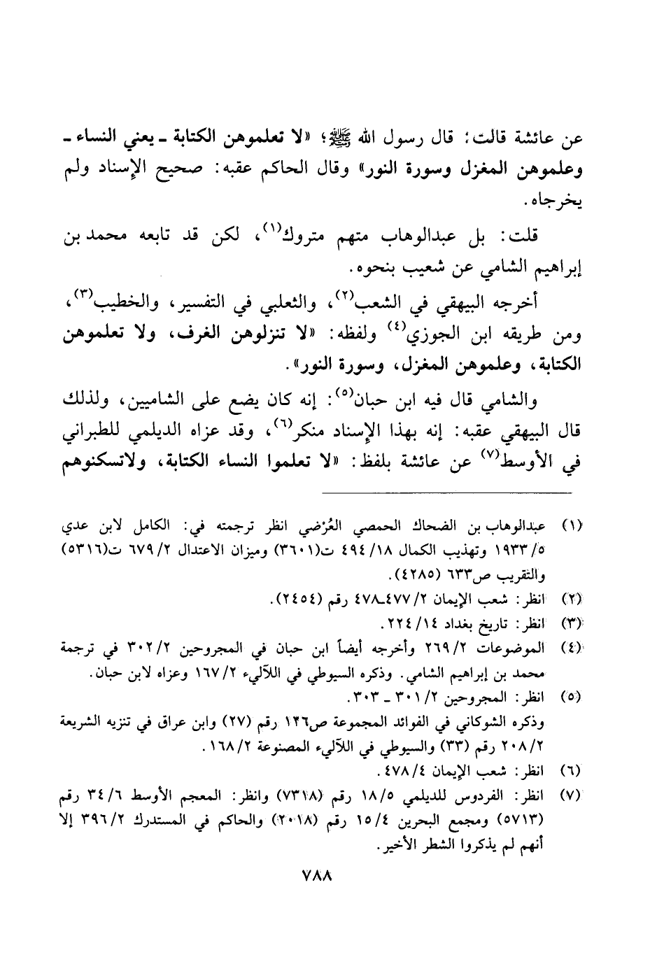 والشامي قال فيه ابن حبان: إنه كان يضع على الشاميين، ولذلك قال البيهقي عقبه: إنه بهذا الإسناد منكر، وقد عزاه الديلمي للطبراني في الأوسط عن عائشة بلفظ: "لا تعلموا النساء الكتابة، ولا تسكنوهم