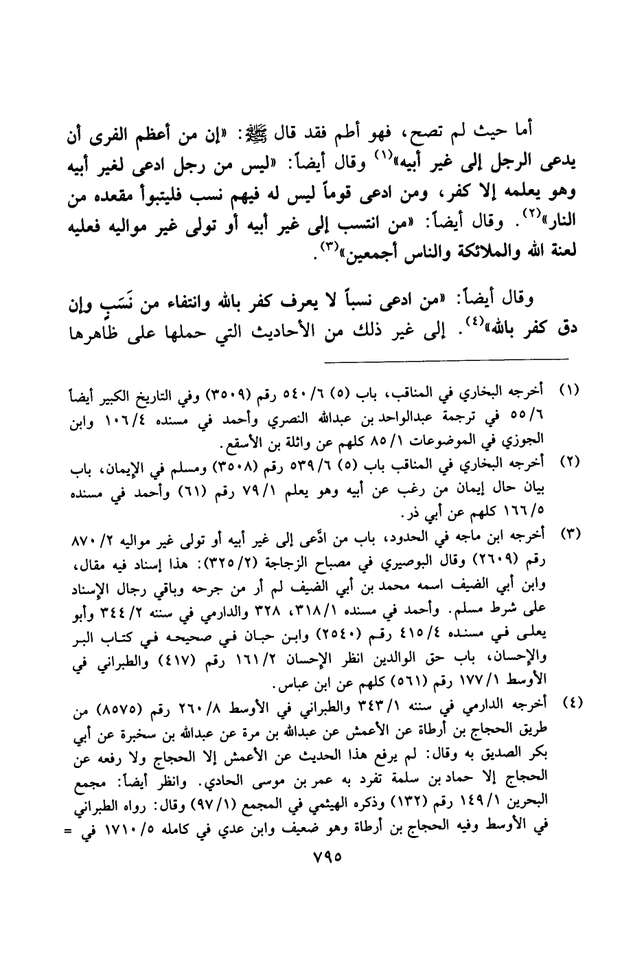 وقال أيضًا: "من ادعى نسبًا لا يعرف كفر بالله وانتفاء من نسب وإن دق كفر بالله". إلى غير ذلك من الأحاديث التي حملها على ظاهرها