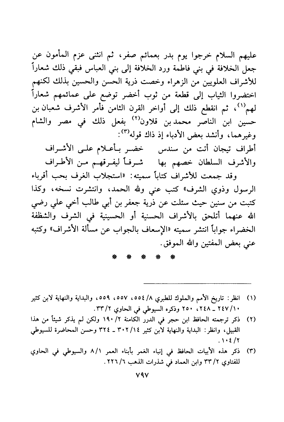 عليهم السلام خرجوا يوم بدر بعمائم صفر، ثم انثنى عزم المأمون عن جعل الخلافة في بني فاطمة ورد الخلافة إلى بني العباس فبقي ذلك شعارًا للاشراف العلويين من الزهراء وخصت ذرية الحسن والحسين بذلك لكنهم اختضروا الثياب إلى قطعة من ثوب أخضر توضع على عمائمهم شعارًا لهم، ثم انقطع ذلك إلى أواخر القرن الثامن فأمر الأشراف شعبان بن حسين ابن الناصر محمد بن قلاون بفعل ذلك في مصر والشام وغيرهما، وأنشد بعض الأدباء إذ ذاك قوله: