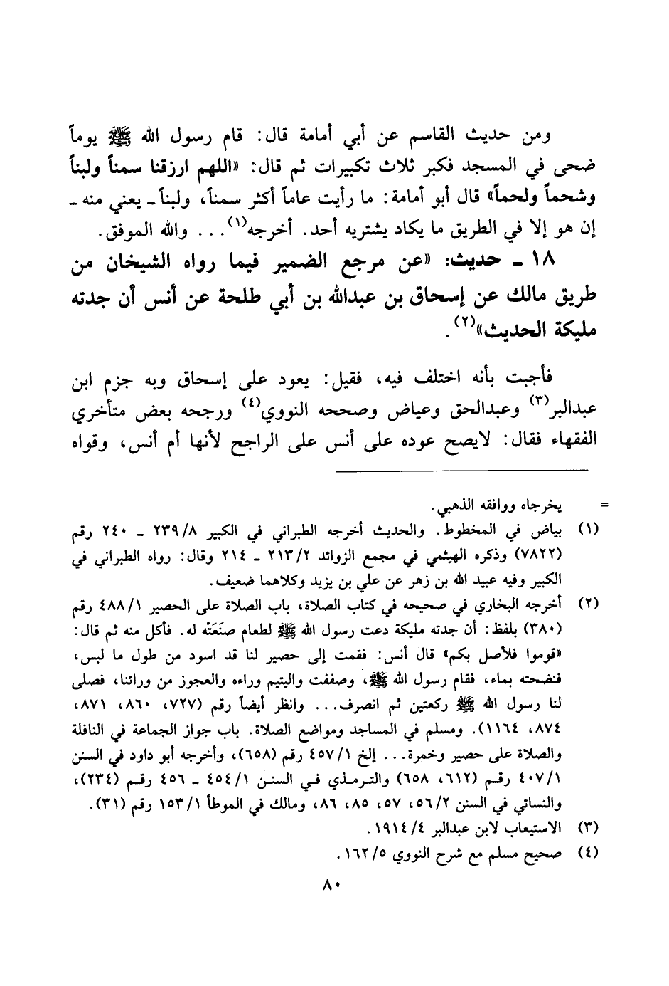 18 - حديث: "عن مرجع الضمير فيما رواه الشيخان من طريق مالك عن إسحاق بن عبد الله بن أبي طلحة عن أنس أن جدته مليكة الحديث".