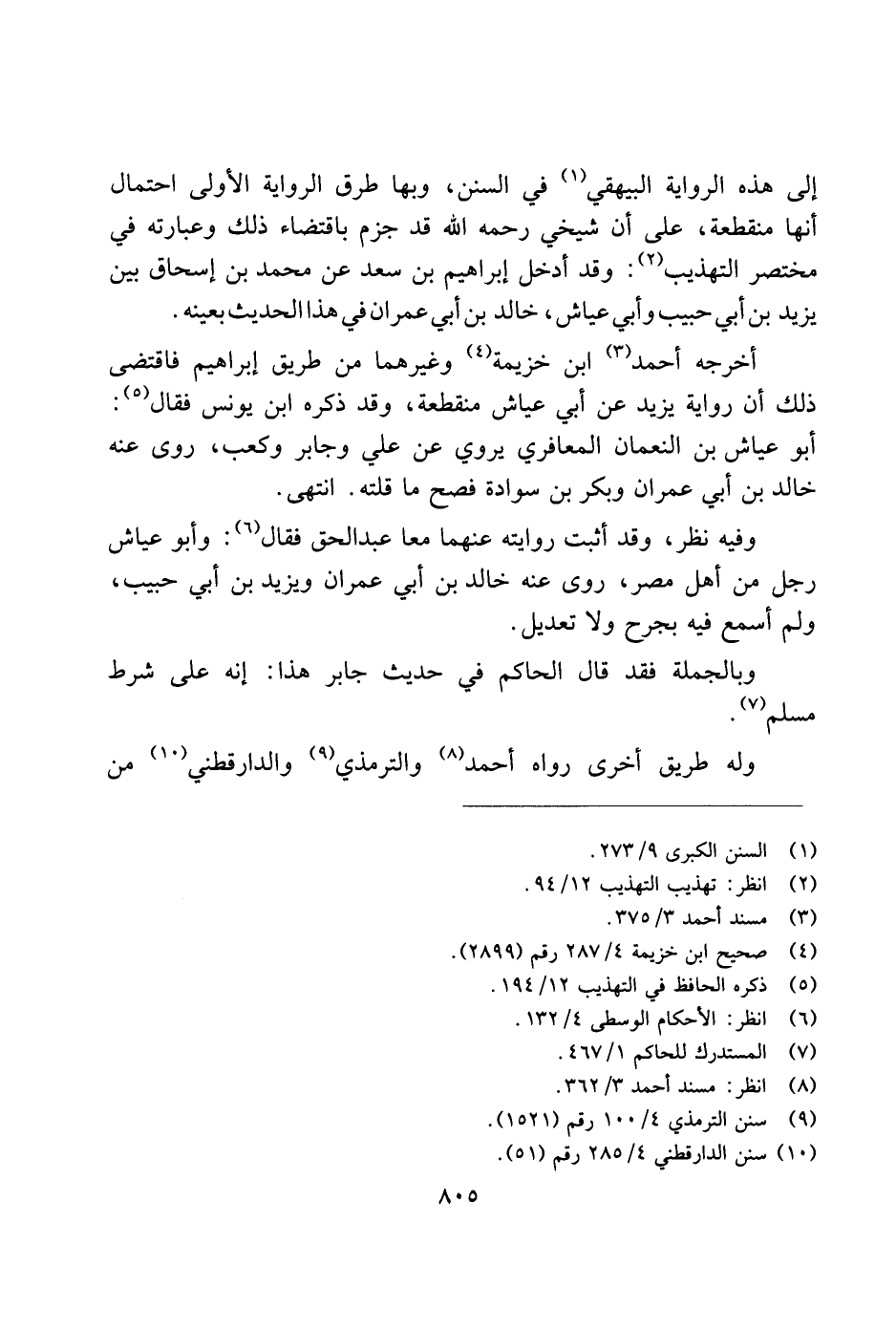 إلى هذه الرواية البيهقي في السنن، وبها طرق الرواية الأولى احتمال أنها منقطعة، على أن شيخي رحمه الله قد جزم باقتضاء ذلك وعبارته في مختصر التهذيب: وقد أدخل إبراهيم بن سعد عن محمد بن إسحاق بين يزيد بن أبي حبيب وأبي عياش، خالدبن أبي عمران في هذا الحديث بعينه.