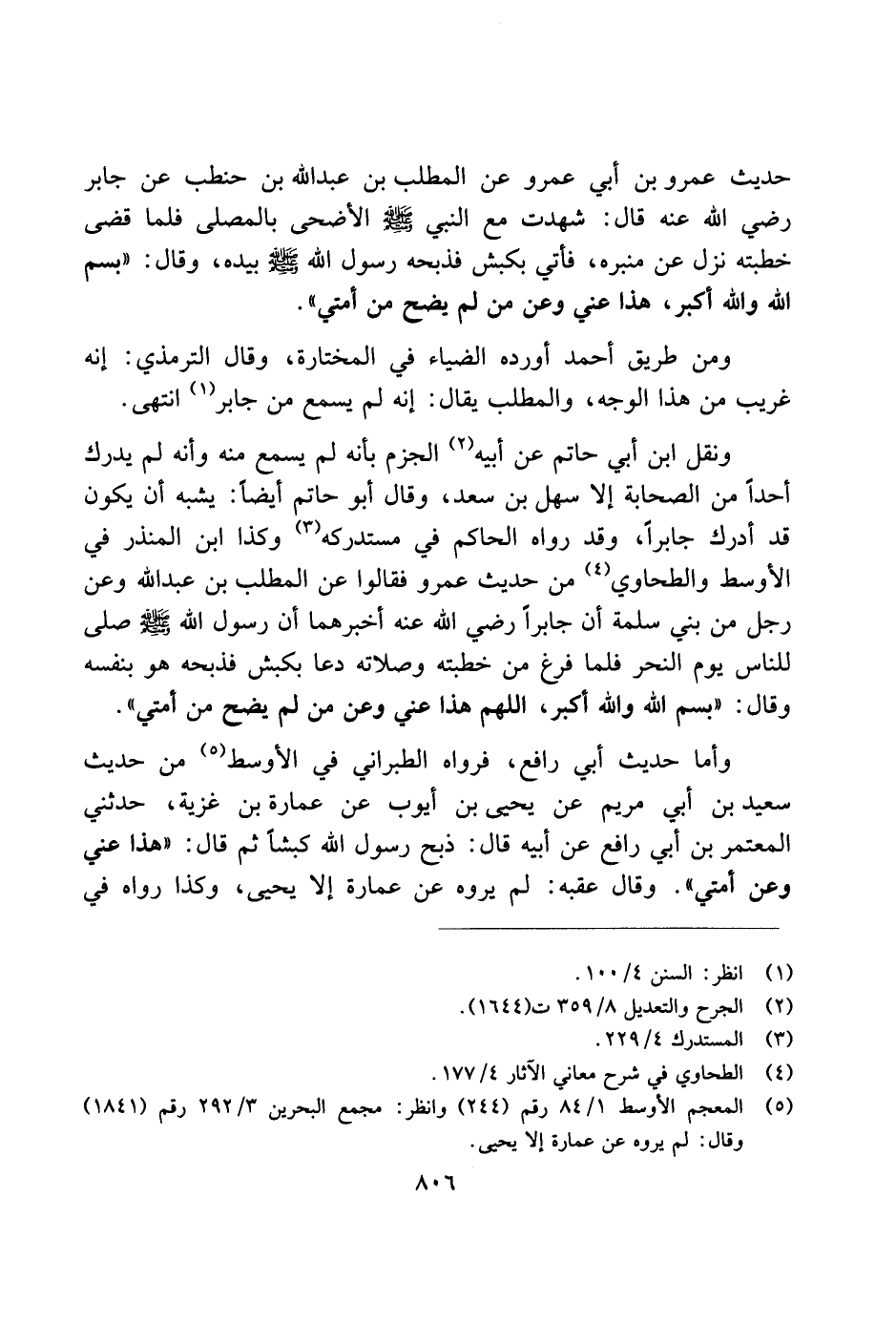 ونقل ابن أبي حاتم عن أبيه الجزم بأنه لم يسمع منه وأنه لم يدرك أحدًا من الصحابة إلا سهل بن سعد، وقال أبو حاتم أيضًا: يشبه أن يكون قد أدرك جابرًا، وقد رواه الحاكم في مستدركه وكذا ابن المنذر في الأوسط والطحاوي من حديث عمرو فقالوا من المطلب بن عبد الله وعن رجل من بني سلمة أن جابرًا رضي الله عنه أخبرهما أن رسول الله صلى الله عليه وسلم صلى للناس يوم النحر فلما فرغ من خطبته وصلاته دعا بكبش فذبحه هو بنفسه وقال: "بسم الله والله أكبر، اللهم هذا عني وعن من لم يضح من أمتي".