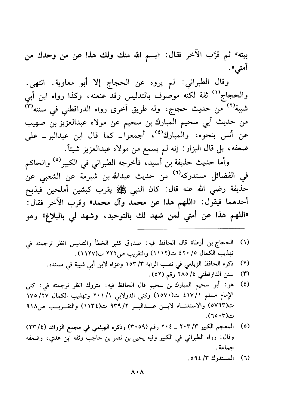 وأما حديث حذيفة بن أسيد، فأخرجه الطبراني في الكبير والحاكم في الفضائل مستدركه من حديث عبد الله بن شبرمة عن الشعبي عن حذيفة رضي الله عنه قال: كان النبي صلى الله عليه وسلم يقرب كبشين أملحين فيذبح أحدهما فيقول: "اللهم هذا عن محمد وآل محمد" وقرب الآخر فقال: "اللهم هذا عن أمتي لمن شهد لك بالتوحيد، وشهد لي بالبلاغ" وهو