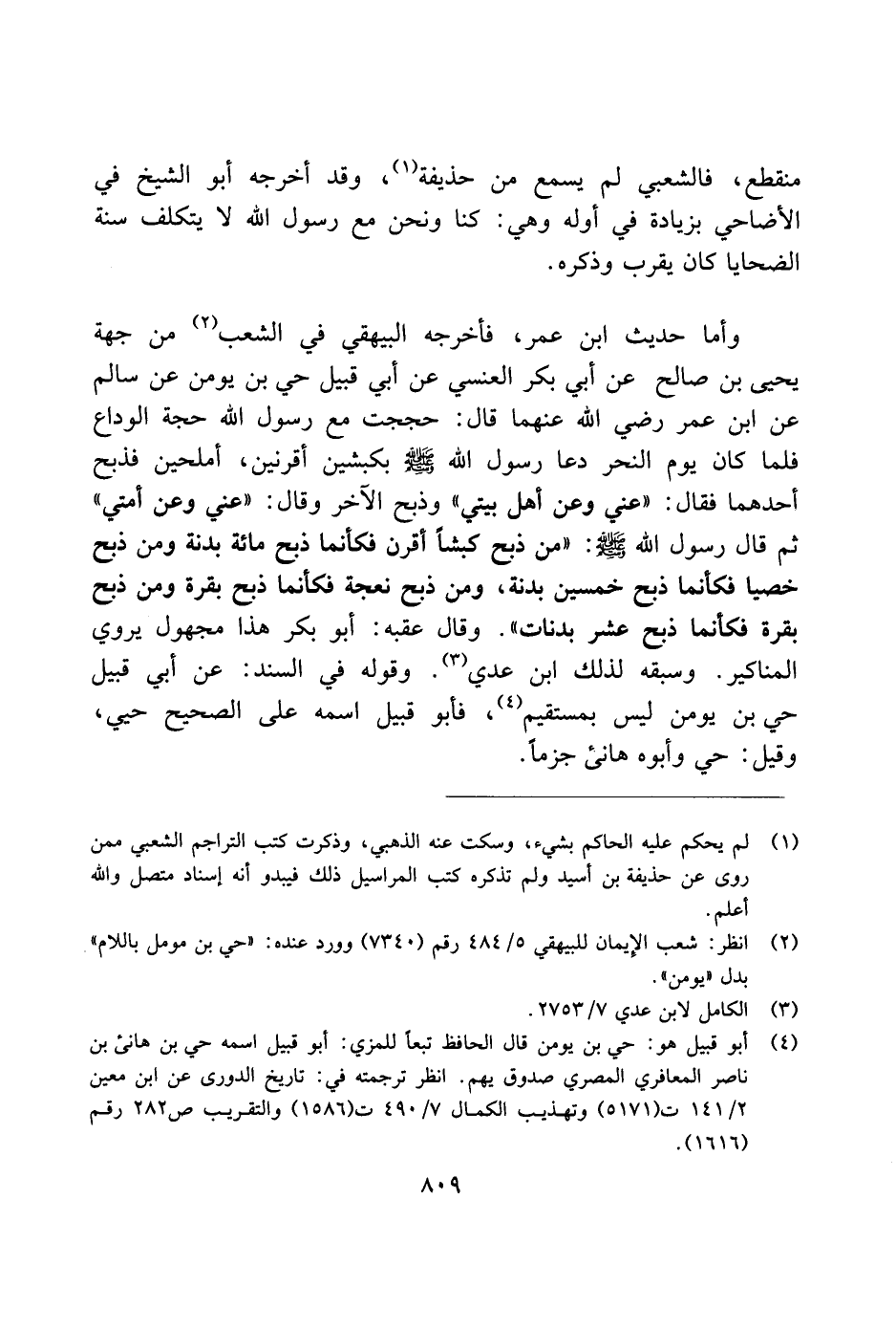 وأما حديث ابن عمر، فأخرجه البيهقي في الشعب من جهة يحيى بن صالح عن أبي بكر العنسي عن أبي قبيل حي بن يومن عن سالم عن ابن عمر رضي الله عنهما قال: حججت مع رسول الله حجة الوداع فلما كان يوم النحر دعا رسول الله صلى الله عليه وسلم بكبشين أقرنين، أملحين فذبح أحدهما فقال: "عني وعن أهل بيتي" وذبح الآخر وقال: "عني وعن أمتي" ثم قال رسول الله صلى الله عليه وسلم: "من ذبح كبشًا أقرن فكأنما ذبح مائة بدنة ومن ذبح خصيًا فكأنما ذبح خمسين بدنة، ومن ذبح نعجة فكأنما ذبح بقرة ومن ذبح بقرة فكأنما ذبح عشر بدنات". وقال عقبه: أبو بكر هذا مجهول يروي المناكير. وسبقه لذلك ابن عدي. وقوله في السند: عن أبي قبيل حي بن يومن ليس بمستقيم، فأبو قبيل اسمه على الصحيح حيي، وقيل: حي وأبوه هانئ جزمًا.
