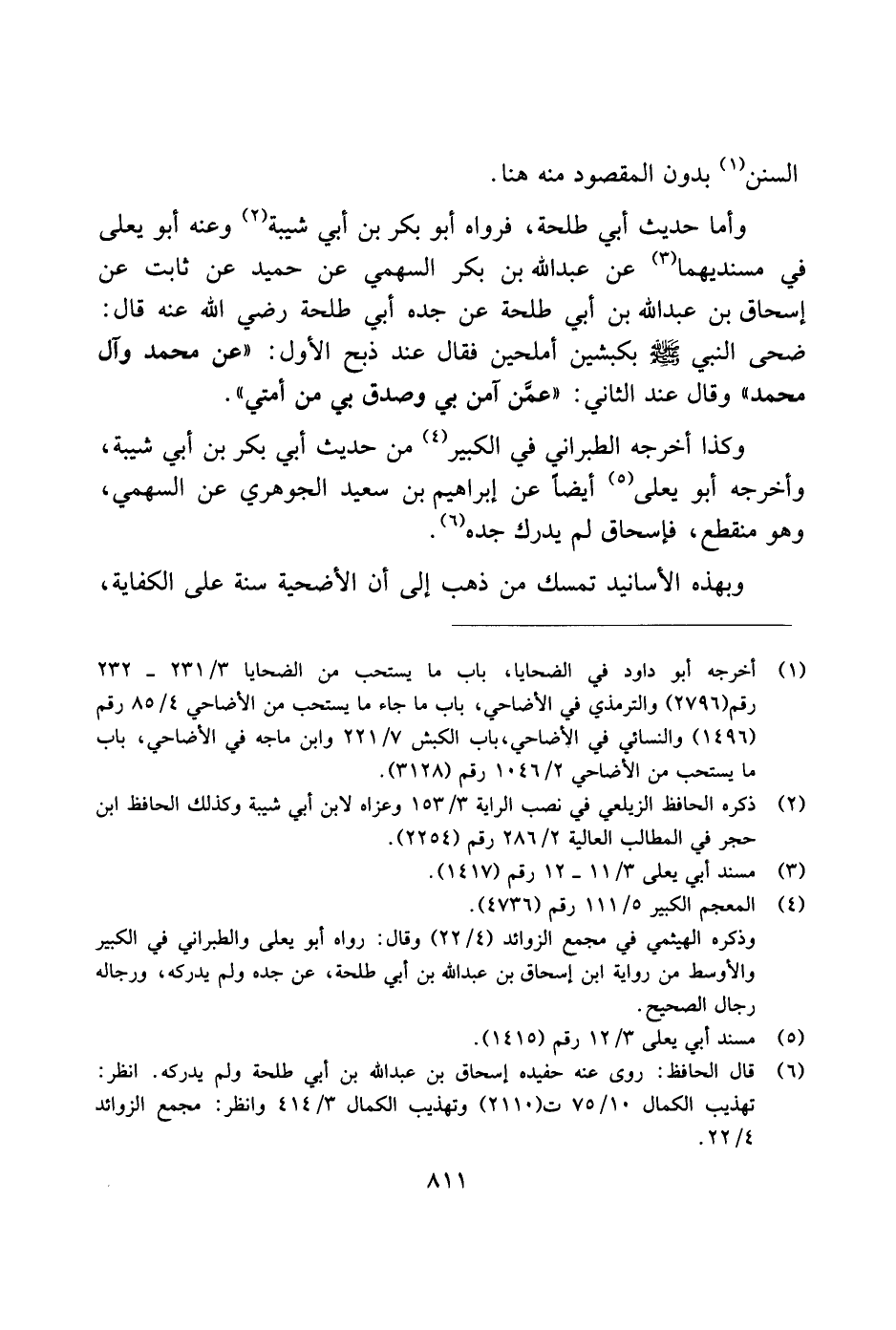 وأما حديث أبي طلحة، فرواه أبو بكر بن أبي شيبة وعنه أبو يعلي في مسنديهما عن عبد الله بن بكر السهمي عن حميد عن ثابت عن إسحاق بن عبد اله بن أبي طلحة عن جده أبي طلحة رضي الله عنه قال: ضحى النبي صلى الله عليه وسلم بكبشين أملحين فقال عند ذبح الأول: "عن محمد وآل محمد" وقال عند الثاني: "عمن آمن بي وصدق بي من أمتي".