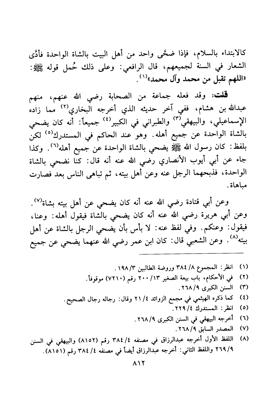 قلت: وقد فعله جماعة من الصحابة رضي الله عنهم، منهم عبد الله بن هشام، ففي آخر حديثه الذي أخرجه البخاري مما زاده الإسماعيلي، والبيهقي والطبراني في الكبير جميعًا: أنه كان يضحي بالشاة الواحدة عن جميع أهله. وهو عند الحاكم في المستدرك لكن بلفظ: كان رسول الله صلى الله عليه وسلم يضحي بالشاة الواحدة عن جميع أهله. وكذا جاء عن أبي أيوب الأنصاري رضي الله عنه أنه قال: كنا نضحي بالشاة الواحدة، فذبحهما الرجل عنه وعن أهل بيته، ثم تباهى الناس بعد فصارت مباهاة.
