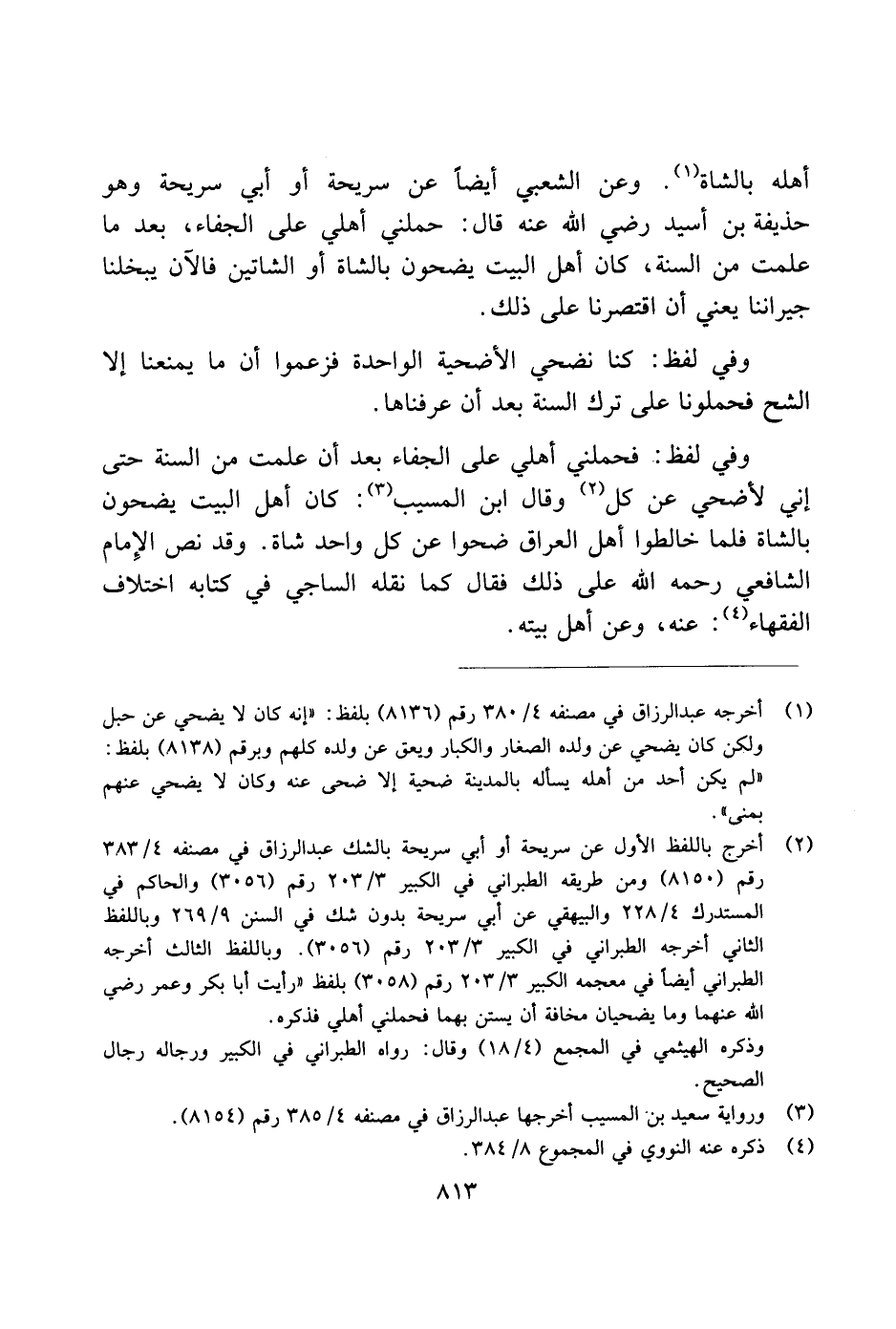 أهله بالشاة. وعن الشعبي أيضًا عن سريحة أو ابي سريحة وهو حذيفة بن اسيد رضي الله عنه قال: حملني أهلي على الجفاء، بعد ما علمت من السنة، كان أهل البيت يضحون بالشاة أو الشاتين فالآن يبخلنا جيراننا يعني أن اقتصرنا على ذلك.