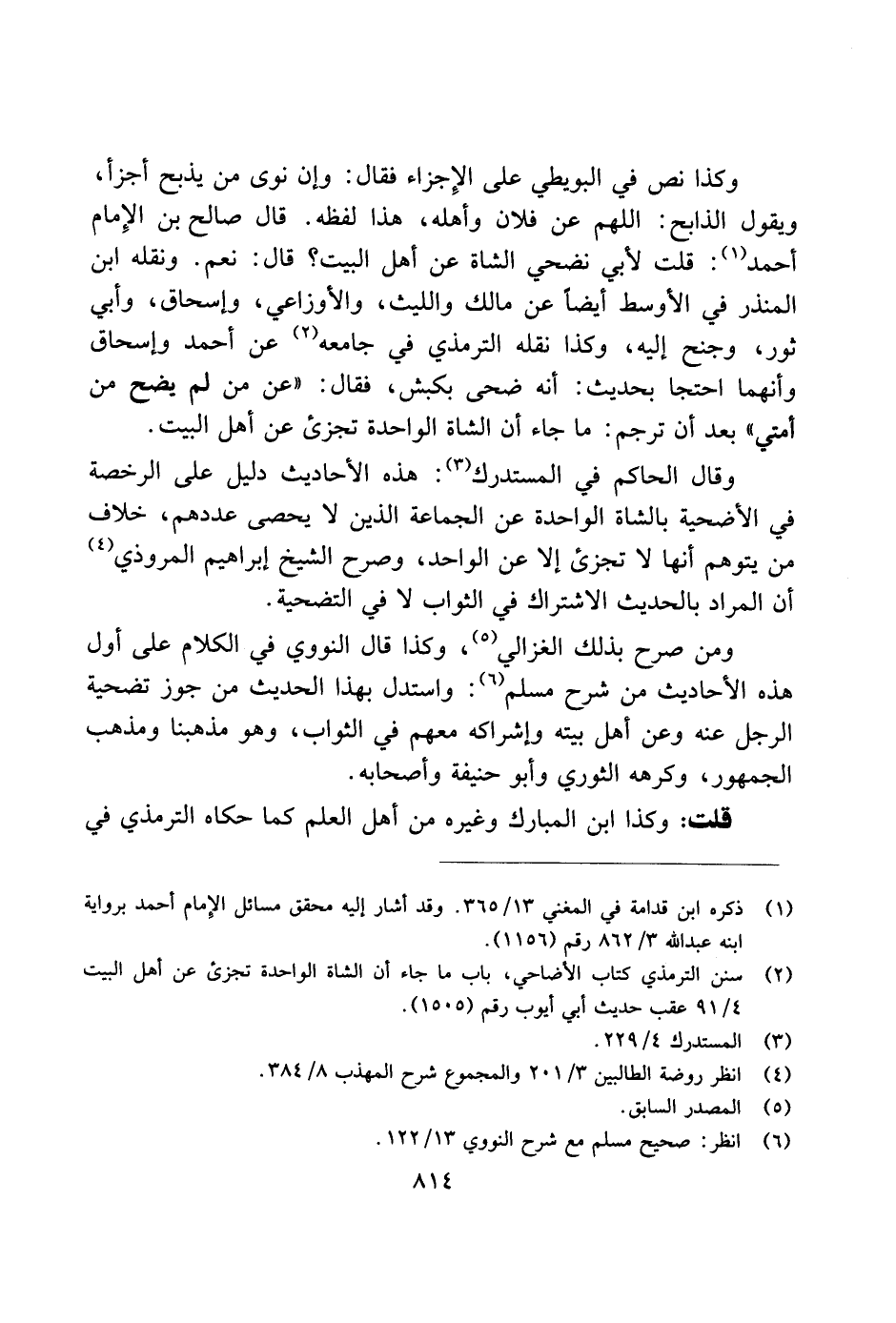 وكذا نص في البويطي على الإجزاء فقال: وإن نوى من يذبح أجزاء، ويقول الذابح: اللهم عن فلان وأهله، هذا لفظه. قال صالح بن الإمام أحمد: قلت لأبي نضجي الشاة عن أهل البيت؟ قال: نعم. ونقله ابن المنذر في الأوسط أيضًا عن مالك والليث، والأوزاعي، وإسحاق، وأبيثور، وجنح إليه، وكذا نقله الترمذي في جامعه عن أحمد وإسحاق وأنهما احتجا بحيدث: أنه ضحى بكبش، فقال: "عن من لم يضح من أمتي" بعدأن ترجم: ما جاء أن الشاة الواحدة تجزئ عن أهل البيت.