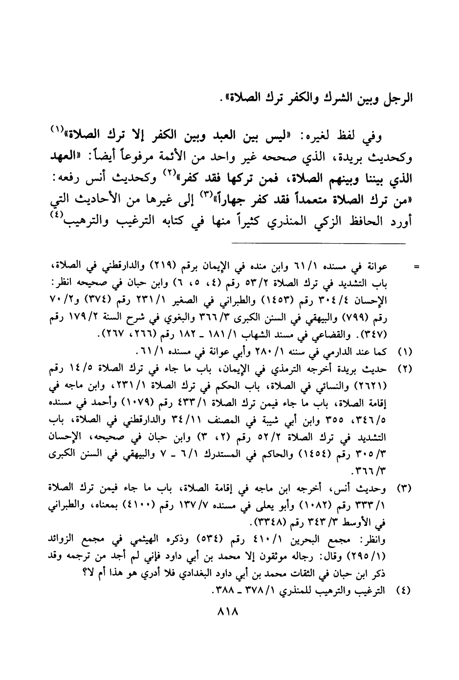 وفي لفظ لغيره: "ليس بين العبد وبين الكفر إلا ترك الصلاة" وكحديث بريدة، الذي صححه غير واحد من الأئمة مرفوعًا أيضًا: "العهد الذي بيننا وبينهم الصلاة، فمن تركها فقد كفر" وكحديث أنس رفعه: "من ترك الصلاة متعمدًا فقد كفر جهارًا" إلى غيرها من الأحاديث التي أورد الحافظ الزكي المنذري كثيرًا منها في كتابه الترغيب والترهيب