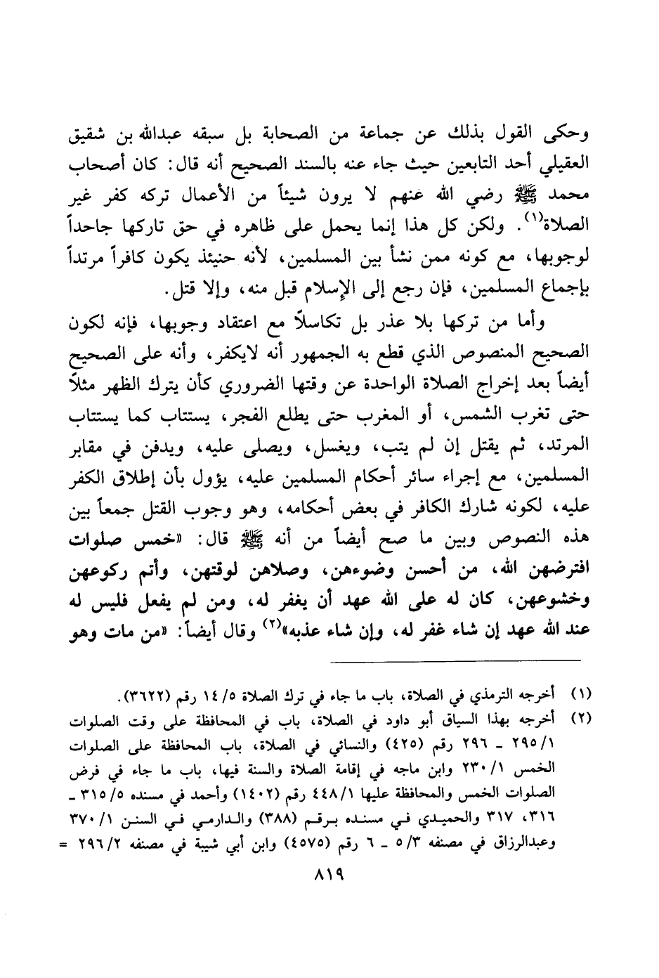 وحكى القول بذلك عن جماعة من الصحابة بل سبقه عبد الله بن شقيق العقيلي أحد التابعين حيث جاء عنه بالسند الصحيح أنه قال: كان أصحاب محمد صلى الله عليه وسلم رضي الله عنهم لا يرون شيئًا من الأعمال تركه كفر غير الصلاة. ولكن كل هذا إنما يحمل على ظاهره في حق تاركها جاحدًا لوجوبها، مع كونه ممن نشأ بين المسلمين، لأنه حينئذ يكون كافرًا مرتدًا بإجماع المسلمين، فإن رجع إلى الإسلام قبل منه، وإلا قتل.