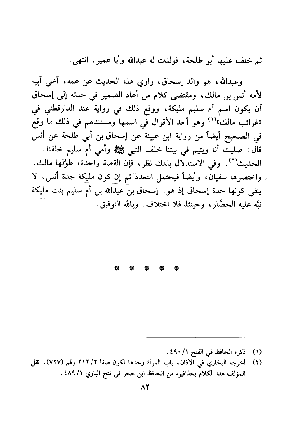 وعبد الله، هو والد إسحاق، راوي هذا الحديث عن عمه، أخي أبيه لأمه أنس بن مالك، ومقتضى كلام من أعاد الضمير في جدته إلى إسحاق أن يكون اسم أم سليم مليكة، ووقع ذلك في وراية عند الدارقطني في "غرائب مالك" وهو أحد الأقوال في اسمها ومستندهم في ذلك ما وقع في الصحيح أيضًا من رواية ابن عيينة عن إسحاق بن أبي طلحة عن أنس قال: صليت أنا ويتيم في بيتنا خلف النبي صلى الله عليه وسلم وأمي أم سليم خلفنا ... الحديث. وفي الاستدلال بذلك نظر، فإن القصة واحدة، طولها مالك، واختصرها سفيان، وأيضًا فيحتمل التعدد ثم إن كون مليكة جدة أنس، لا ينفي كونها جدة إسحاق إذ هو: إسحاق بن عبد الله بن أم سليم بنت مليكة نبه عليه الحصار، وحينئذ فلا اختلاف. وبالله التوفيق.