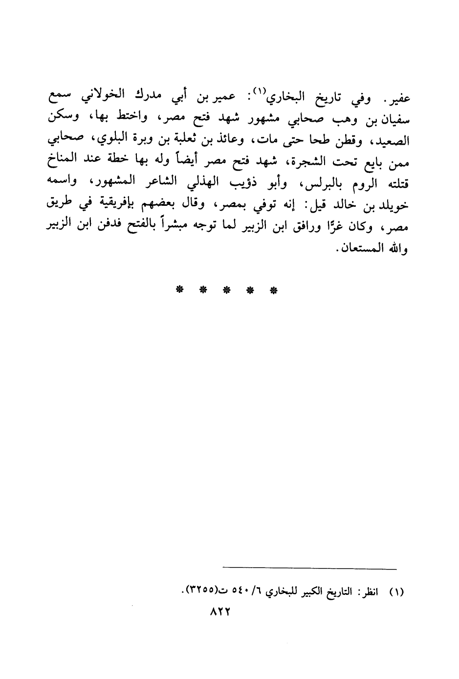عفير. وفي تاريخ البخاري: عمير بن أبي مدرك الخولاني سمع سفيان بن وهب صحابي مشهور شهد فتح مصر، واختط بها، وسكن الصعيد، وقطن طحا حتى مات، وعائذ بن ثعلبة بن وبرة البلوي، صحابي ممن بايع تحت الشجرة، شهد فتح مصر أيضًا وله بها خطة عند المناخ قتلته الروم بالبرلس، وأبو ذؤيب الهذلي الشاعر المشهور، واسمه خويلد بن خالد قيل: إنه توفي بمصر، وقال بعضهم بإفريقية في طريق مصر، وكان غرًا ورافق ابن الزبير لما توجه مبشرًا بالفتح فدفن ابن الزبير والله المستعان.