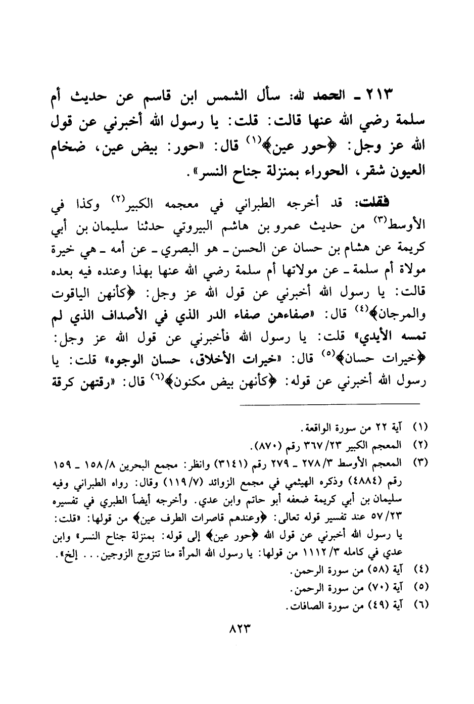 213 - الحمد لله: سأل الشمس ابن القاسم عن حديث أم سلمة رضي الله عنها قالت: قلت: يا رسول الله أخبرني عن قول الله عز وجل: (حور عين) قال: "حور: بيض عين، ضخام العيون شقر، الحوراء بمنزلة جناح انسر".