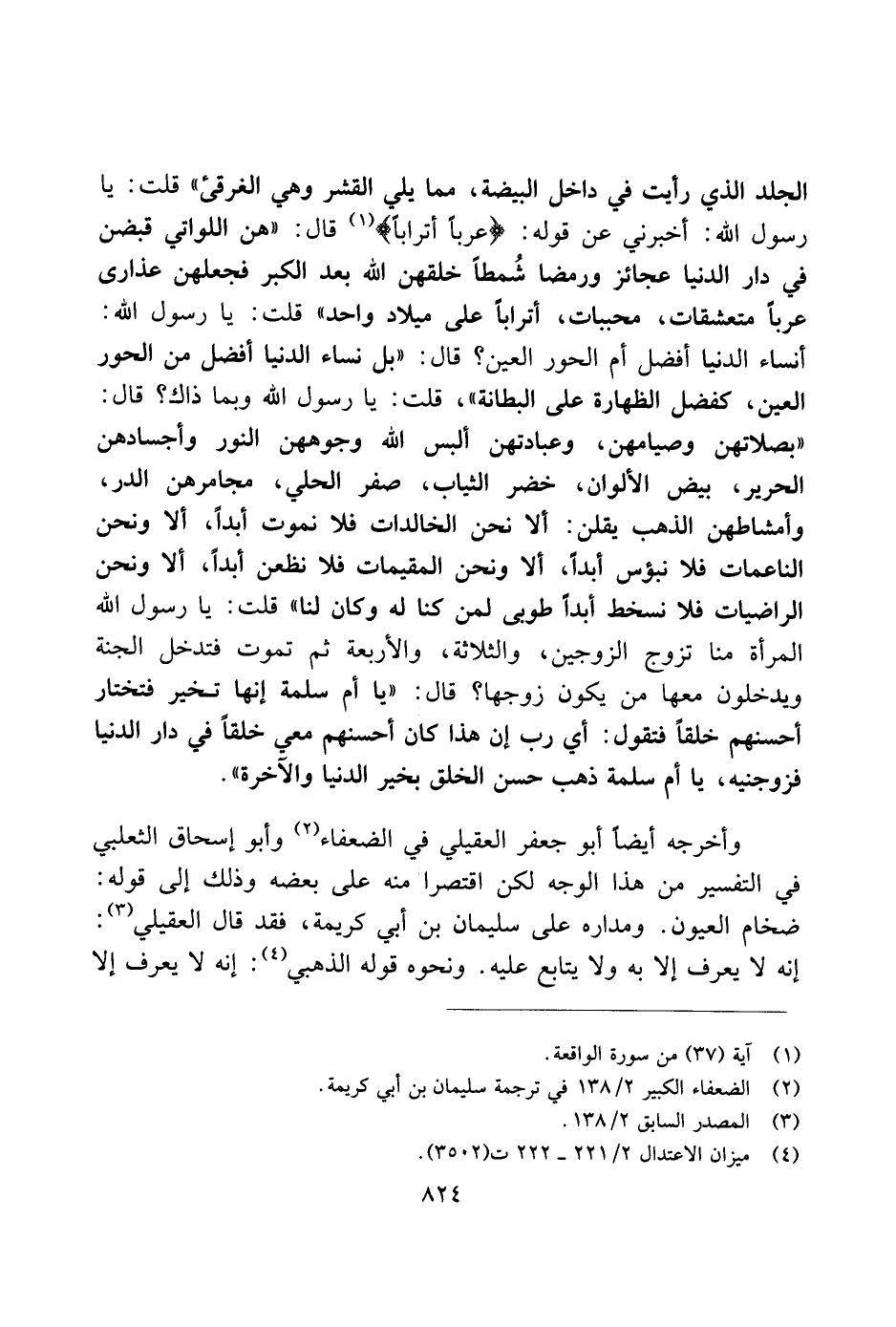 الجلد الذي رأيت في داخل البيضة، مما يلي القشر وهي الغرقئ" قلت: يا رسول الله: أخبرني عن قوله: (عربًا أترابا) قال: "هن اللواتي قبضن في دار الدنيا عجائز ورمضا شُمطا خلقهن الله بعد الكبر فجعلهن عذارى عربًا متعشقات، محببات، أترابًا على ميلاد واحد" قلت: يا رسول الله: أنساء الدنيا أفضل أم الحور العين؟ قال: "بل نساء الدنيا أفضل من الحور العين، كفضل الظهارة على البطانة"، قلت: يا رسول الله وبما ذاك؟ قال: "بصلاتهن وصيامهن، وعبادتهن ألبس الله وجوههن النور وأجسادهن الحرير، بيض الألوان، خضر الثياب، صفر الحلي، مجامرهن الدر، وأمشاطهن الذهب يقلن: ألا نحن الخالدات فلا نموت أبدًا، ألا ونحن الناعمات فلا نبؤس أبدًا، ألا ونحن المقيمات لا نظعن أبدًا، ألا ونحن اراضيات فلا نسخط أبدًا طوبى لمن كنا له وكان لنا" قلت: يا رسول الله المرأة منا تزوج الزوجين، والثلاثة، والأربعة ثم تموت فتدخل الجنة ويدخلون معها من يكون زوجها؟ قال: "يا أم سلمة إنها تخير فتختار أحسنهم خلقًا فتقول: أي رب إن هذا كان أحسنهم معي خلقًا في دار الدنيا فزوجنيه، يا أم سلمة ذهب حسن الخلق بخير الدنيا والآخرة".