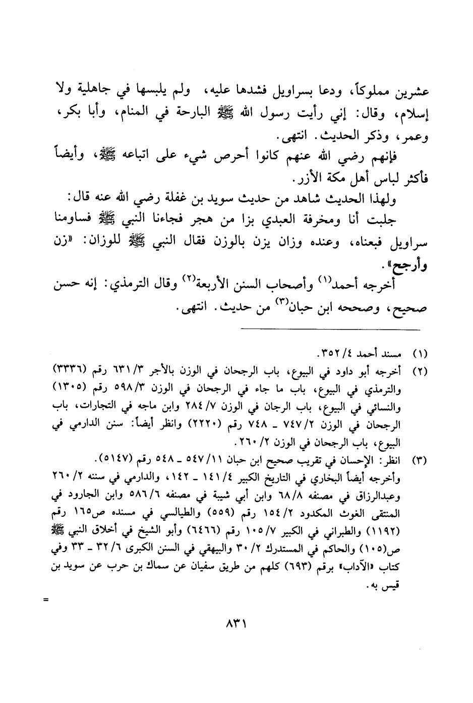 جلبت أنا ومخرفة العبدي بزا من هجر فجاءنا النبي صلى الله عليه وسلم فساومنا سراويل فبعناه، وعنده وزان يزن بالوزن فقال النبي صلى الله عليه وسلم للوزان: "زن وأرجح".
