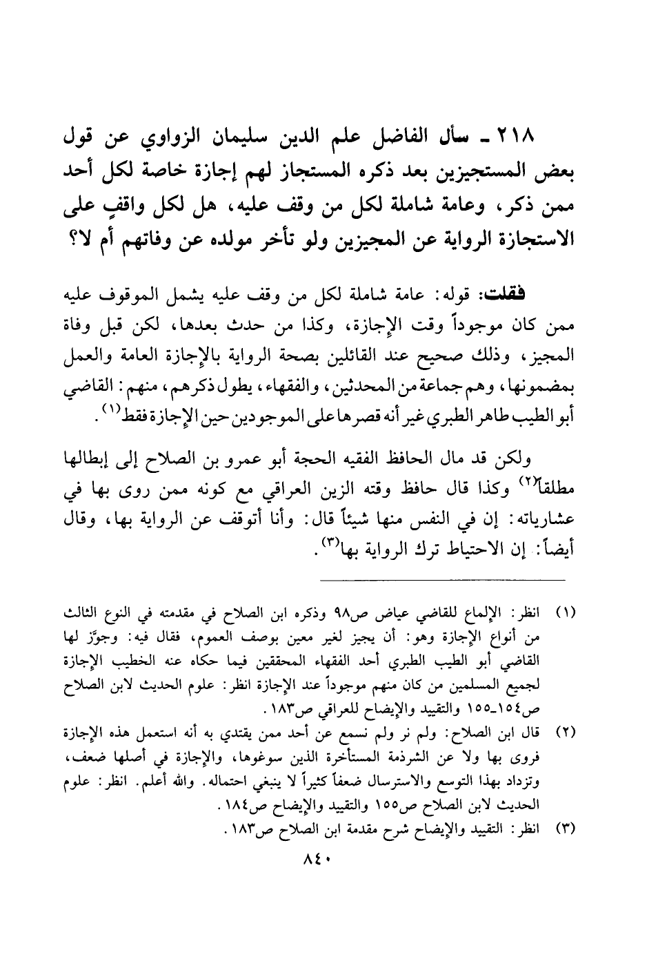 218 - سأل الفاضل علم الدين سليمان الزواوي عن قول بعض المستجيزين بعد ذكره المستجاز لهم إجازة خاصة لكل أحد ممن ذكر، وعامة شاملة لكلمن وقف عليه، هل لكل واقف على الاستجازة الرواية عن المجيزين ولو تأخر مولده عن وفاتهم أم لا؟