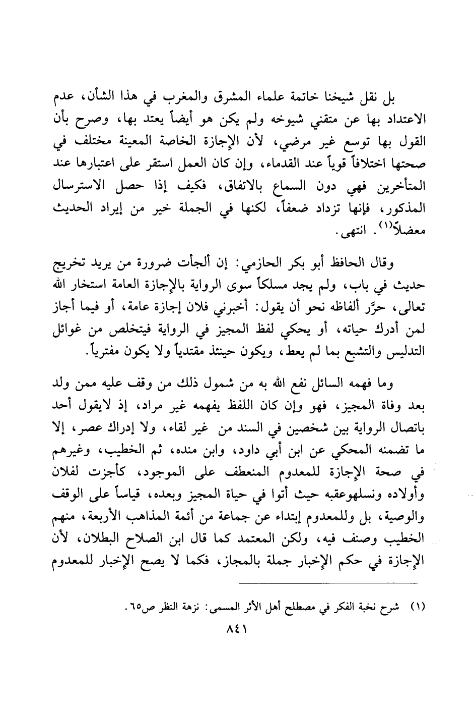 وما فهمه السائل نفع الله به من شمول ذلك من وقف عليه ممن ولد بعد وفاة المجيز، فهو وإن كان اللفظ يفهمه غير مراد، إذ لا يقول أحد باتصال الرواية بين شخصين في السند من غير لقاء، ولا إدراك عصر، إلا ما تضمنه المحكي عن ابن أبي داود، وابن منده، ثم الخطيب، وغيرهم في صحة الإجازة للمعدوم المنعطف على الموجود، كأجزت لفلان وأولاده ونسلهو عقبه حيث أتوا في حياة المجيز وبعده، قياسًا على الوقف والوصة، بل وللمعدوم ابتداء عن جماعة من أئمة المذاهب الأربعة، منهم الخطيب وصنف فيه، ولكن المعتمد كما قال ابن الصلاح البطلان، لأن الإجازة في حكم الإخبار جملة بالمجاز، فكما لا يصح الإخبار للمعدوم